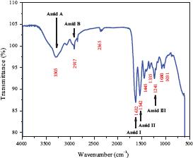 Figure 5 shows the FTIR spectrum of a typically extracted fish gelatin in the form of a free-standing film. The obtained FTIR spectrum reveals that the peaks of gelatin transmittance are consistent with those reported in the literature [39–45].