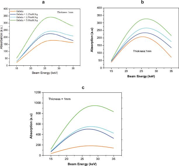 Figure 7 shows the X-ray absorption of freestanding films made of AgNPs entrained camel (a), fish (b), and bovine (c) gelatin. The thickness of the films was 1 mm each and the potential was set to 15, 25.5, and 35 kV potential with a beam current of 1 mA. When exposed to 25.5 kV, silver nanoparticles exhibit their highest level of absorbance, indicating that the photon’s energy is just slightly higher than the silver nanoparticles’ K-edge binding energy. Additionally, there is a direct correlation between the absorption and the amount of gelatin and silver nanoparticles. Tested samples showed qualitatively similar behavior, but different amounts of X-ray absorption were recorded. Bovine gelatin/AgNPs demonstrated the highest absorption, followed by camel and fish gelatin.