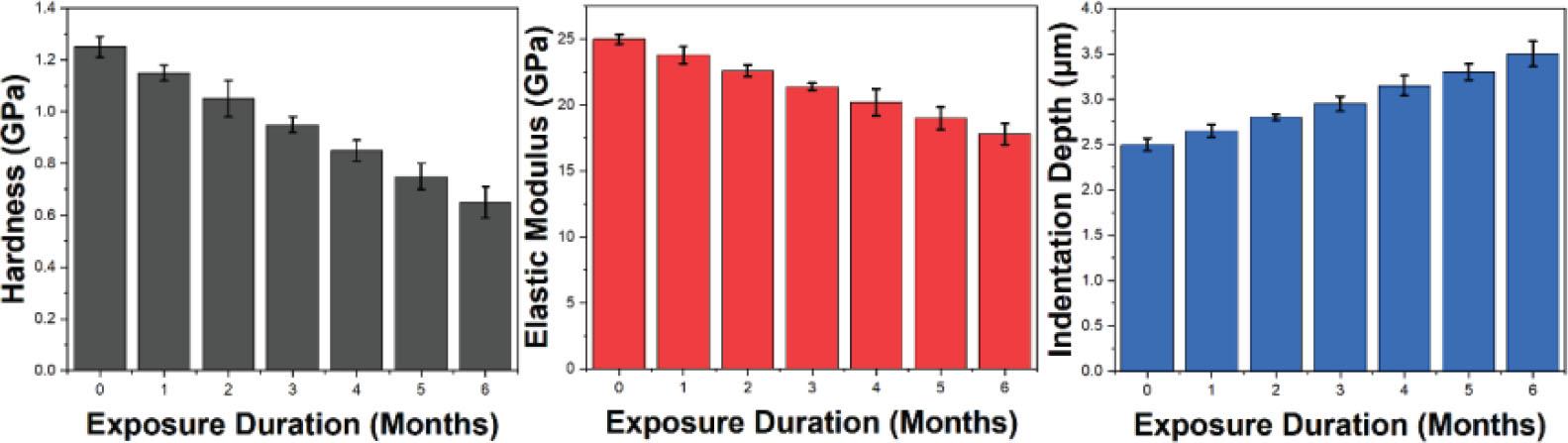 | Exposure Duration (Months) | Hardness (GPa) | Elastic Modulus (GPa) | Indentation Depth (μ m) |