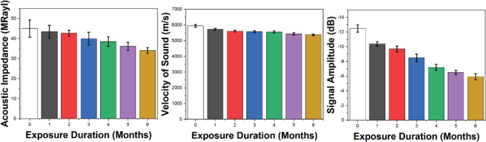 | Exposure Duration (Months) | Acoustic Impedance (MRayl) | Velocity of Sound (m/s) | Signal Amplitude (dB) |