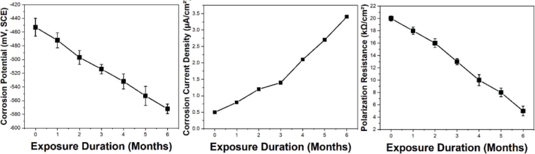 | Exposure Duration (Months) | Corrosion Potential (mV, SCE) | Corrosion Current Density (μA/cm2) | Polarization Résistance (kΩ/cm2) |