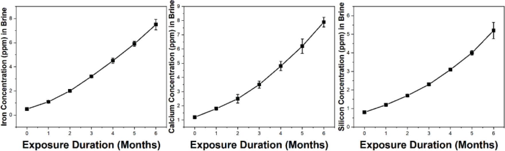 | Exposure Duration (Months) | Iron Concentration (ppm) in Brine | Calcium Concentration (ppm) in Brine | Silicon Concentration (ppm) in Brine |