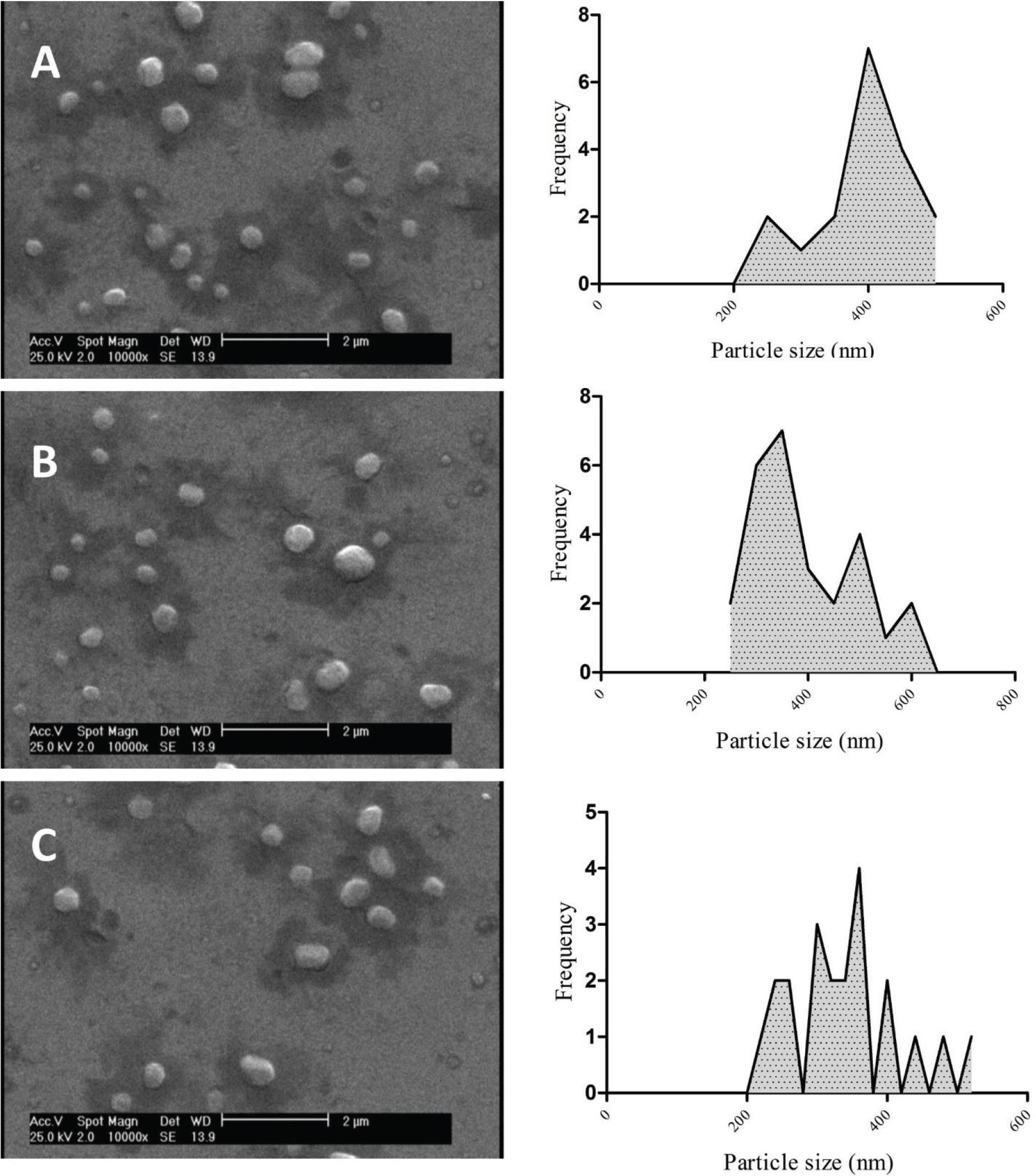 SEM images of (A) RESALNPs, (B) PREALNPs, and (C) drug-free ALNPs. Right panel shows the size distribution of each nanocarrier