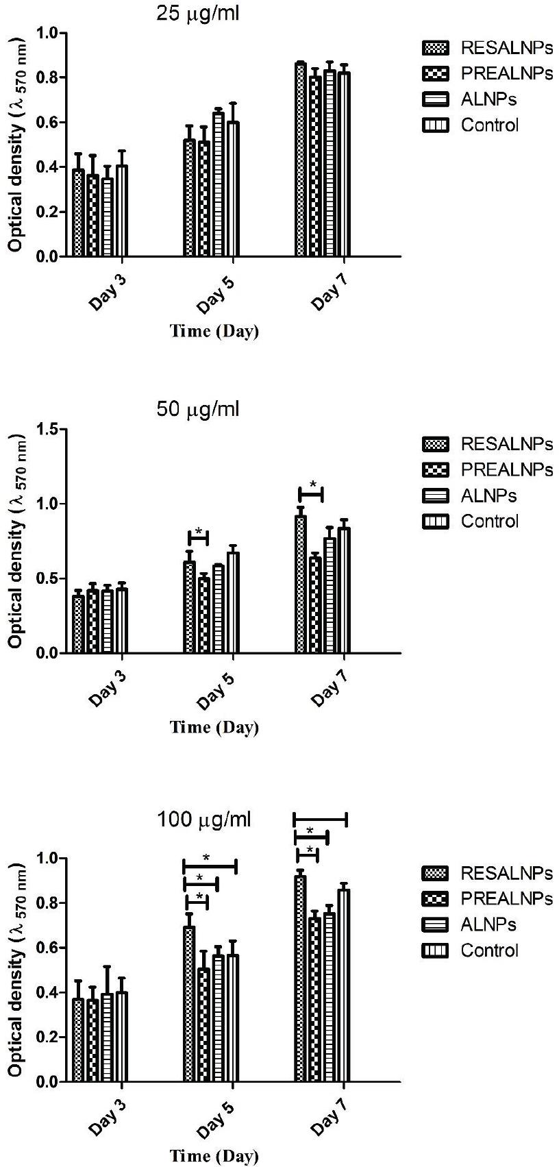 Results (Figure 2) showed that at 25 μg/ml concentration, the viability of MG63 cells was not significantly different between control and RESAL-NPs, PREALNPs, and ALNPs groups, with p-value > 0.05. At 50 and 100 μg/ml concentrations; on days 5 and 7, cells cultured with RESALNPs had significantly higher cell viability than the cells cultured with PREALNPs, p-value < 0.05.