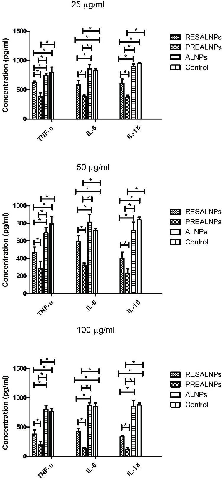Results (Figure 3) showed that at all the studied concentrations, the anti-inflammatory activity of ALNPs was not significantly different from the control group, signifying the negligible immunomodulatory potential of ALNPs. At all concentrations, the immunomodulatory activity of PREALNPs was significantly higher than that of other groups. In addition, the immunomodulatory activity of RESALNPs was significantly higher than that of ALNPs and control groups.