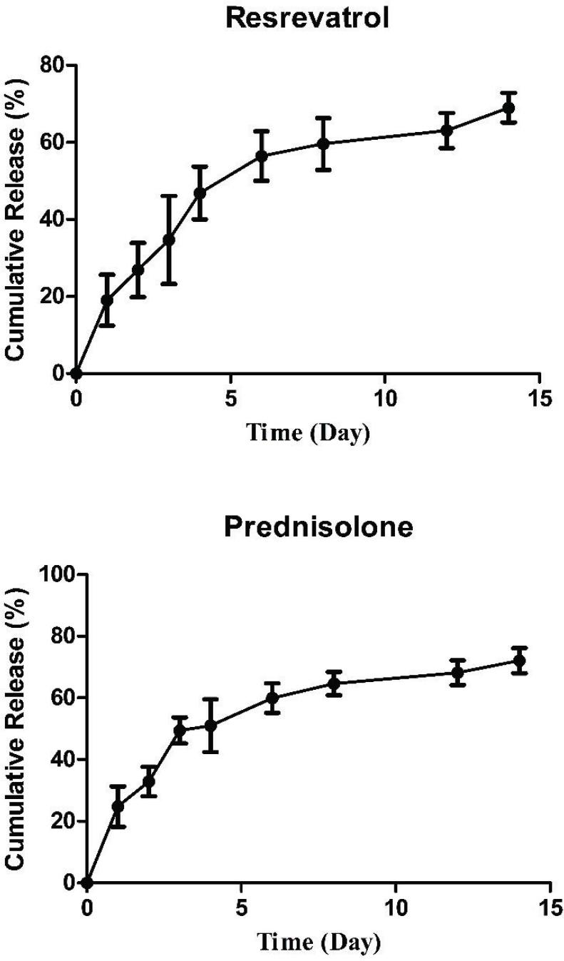 Results (Figure 4) showed that resveratrol and prednisolone were released from PREALNPs and RESALNPs in a controlled manner that sustained for over 14 days. Drug release initiated by a burst release phase that continued with a slow release phase. At the end of 14th day, the cumulative release of resveratrol and prednisolone were around 68.99 ± 3.83% and 72.15 ± 4.08%, respectively.
