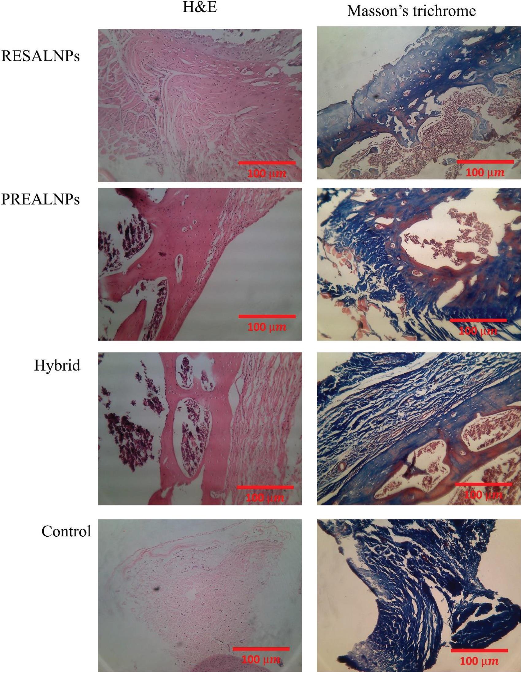 In order to induce a rheumatoid joint model, 5 μg/kg of Complete Freund’s adjuvant (CFA) with type II bovine collagen (both purchased from Sigma Aldrich, USA) were injected into the paw joint of Male Wistar rats three times during a 10-day interval. Then, the animals were randomly divided into four groups as follows: 1 – PRE-ALNPs in which the animals received oral gavage of PREALNPs (400 μg/kg in normal saline solution), 2 – RESALNPs in which the animals received oral gavage of RESALNPs (400 μg/kg in normal saline solution), 3 – Hybrid group in which the animals received oral gavage of both PREALNPs and RESALNPs (400 μg/kg in normal saline solution), 4 – Control group in which the animals only received normal saline solution. The treatment plan continued until day 21. Then, the animals were sacrificed with ketamine overdose, and cartilage tissues were harvested for histopathological examinations using Hematoxylin and Eosin (H&E) staining and Masson’s trichrome staining.