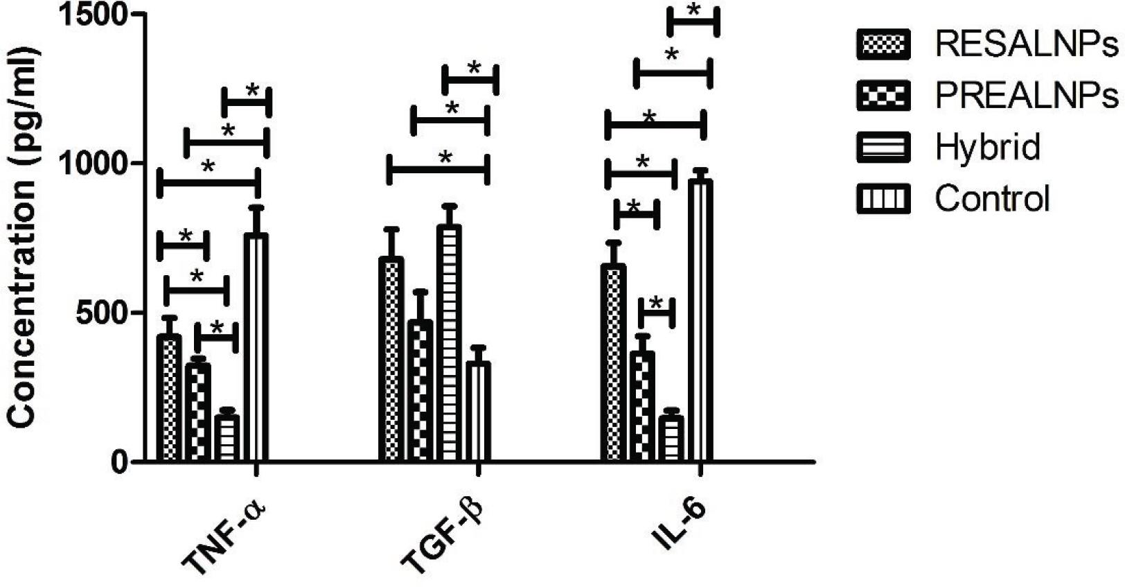Results (Figure 6) showed that the tissue concentrations of IL-6 and TNF-α in the control group were significantly higher than other groups. The Hybrid group had significantly lower concentrations of these cytokines than other groups. TGF-β concentrations in the RESALNPs, PREALNPs, and hybrid groups were significantly higher than control groups.