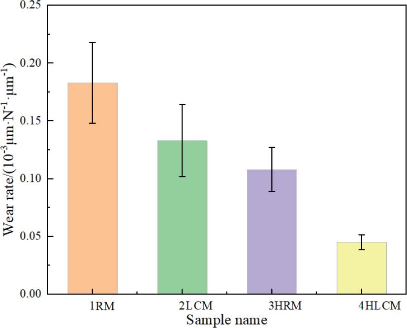 Before and after the solution-aging heat treatment, the wear pattern of the material changed significantly, with the wear profile of the material after heat treatment being narrower and “V”-shaped, and the wear profile of the material after heat treatment being larger and “U”-shaped. After heat treatment, the cladding layer has the shallowest wear marks and relatively smooth edges, with a minimum wear rate of only 0.045, showing good wear resistance. The surface of the abrasion mark of the material produced by rolling before heat treatment showed wide and deep furrows, and the surface after friction abrasion produced obvious flaking, with a maximum wear rate of 0.183. The wear rate of the 18Ni300 cladding layer made by laser cladding after heat treatment was reduced by 66.1% compared with that before heat treatment, and the wear rate of the material produced by rolling before heat treatment was reduced by 41.2% compared with that before heat treatment. This proves that the heat treatment has a greater effect on the wear rate of the cladding layer manufactured by laser cladding than that of the material produced by rolling.