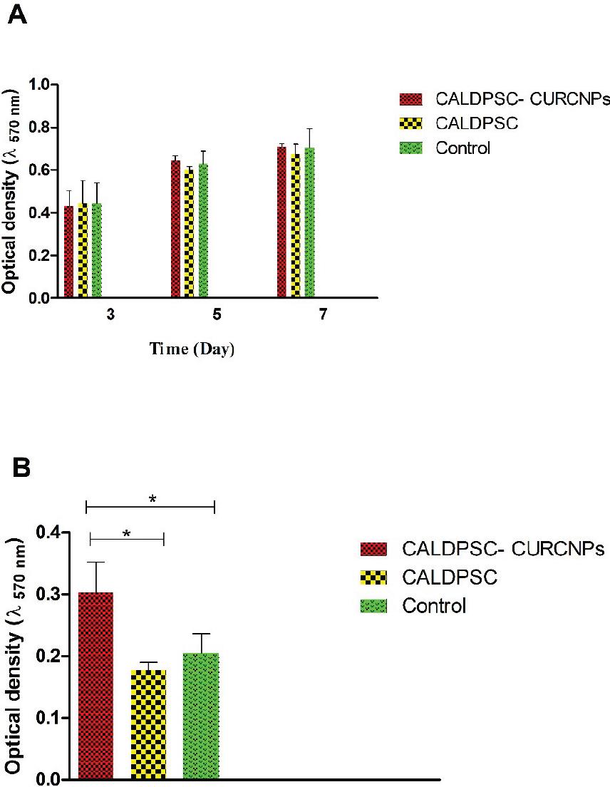 Viability of DPSCs cultured on CALDPSC-CURCNPs and CALDPSC hydrogels under (A) normal and (B) oxidative stress conditions, * shows p-value < 0.05