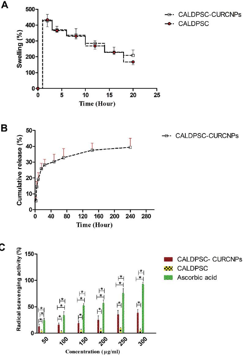 Graphs showing (A) swelling behavior of CALDPSC-CURCNPs and CALDPSC hydrogels, (B) release of curcumin from CALDPSC-CURCNPs hydrogels, and (C) radical scavenging activity of CALDPSC-CURCNPs and CALDPSC hydrogels compared with ascorbic acid. * shows p-value < 0.05