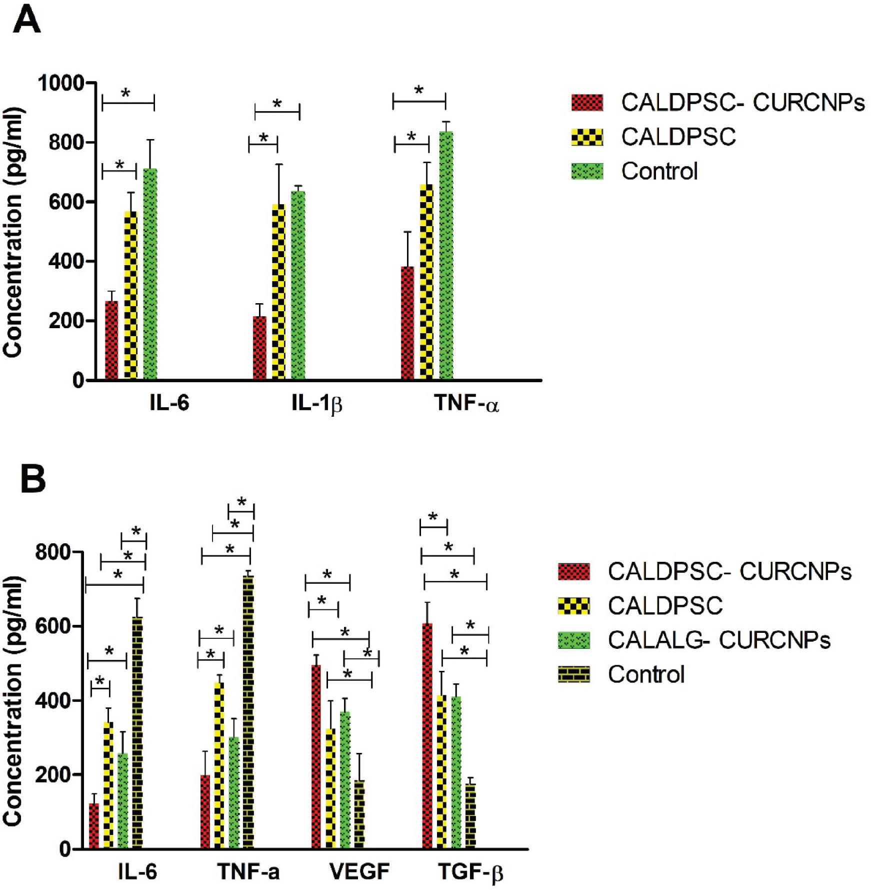Results (Figure 3A) showed that J774A1 cells cultured on CALDPSC-CURCNPs hydrogels released significantly lower amounts of Il-6, IL-1β, and TNF-α than the cells cultured on CALDPSC and tissue culture plate. Differences between control and CALDPSC groups were not significant.
