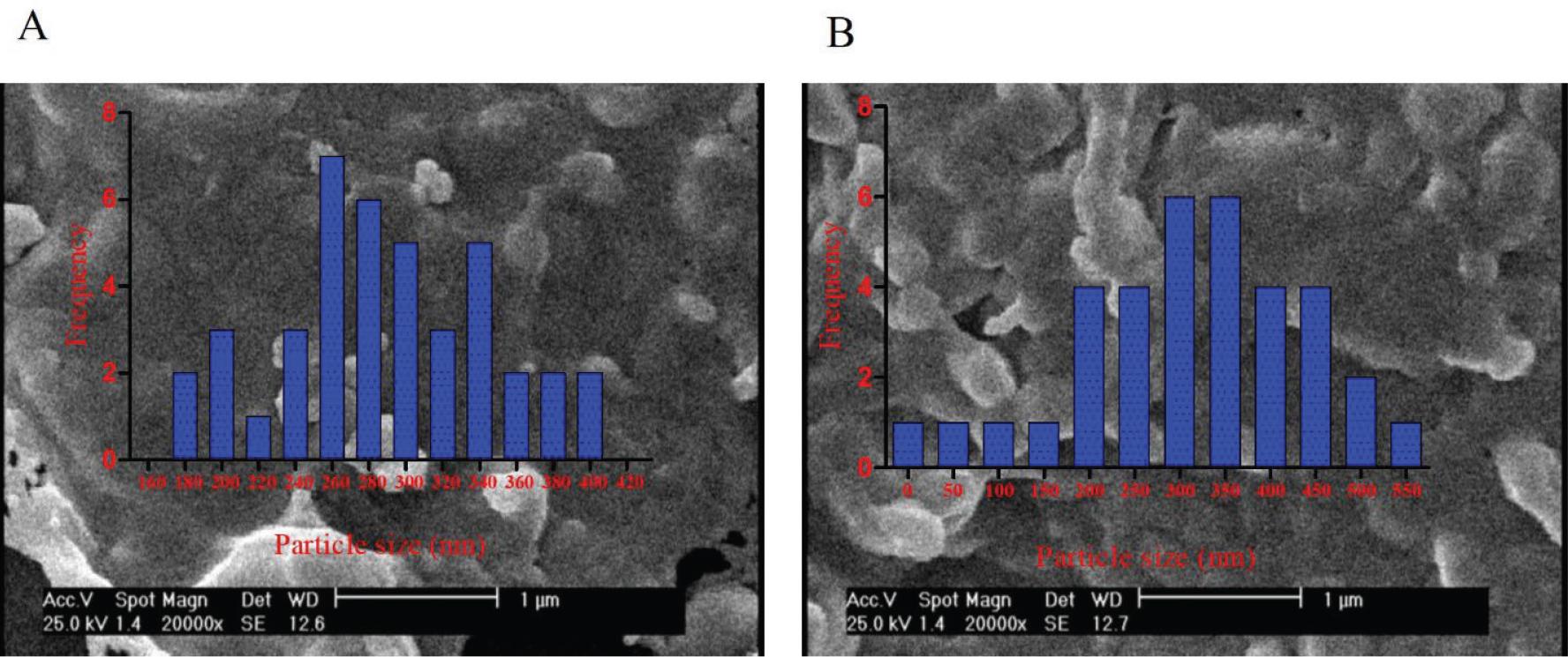 Results (Figure 4) showed that CURCNPs and curcumin-free nanoparticles had round and smooth particles with a wide size distribution. The average size of the CURCNPs and curcumin-free nanoparticles was measured to be 288.55 ± 57.04 nm and 310.001 ± 125.56 nm, respectively.