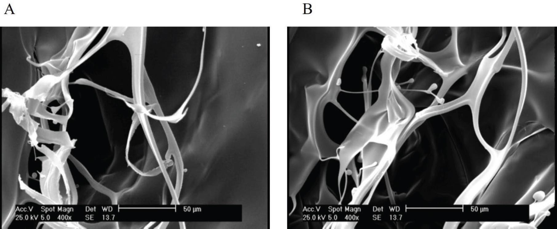 Representative scanning electron microscopy images of (A) CALDPSC-CURCNPs and (B) CALDPSC hydrogels