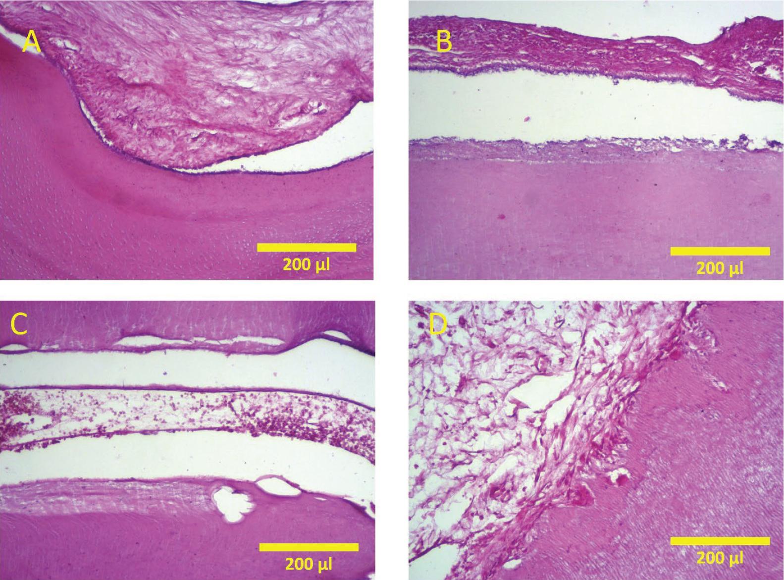Representative H&E staining images of dental pulp tissues treated with (A) CALDPSC-CURCNPs, (B) CALDPSC, (C) CALALG-CURCNPs, and (D) control group