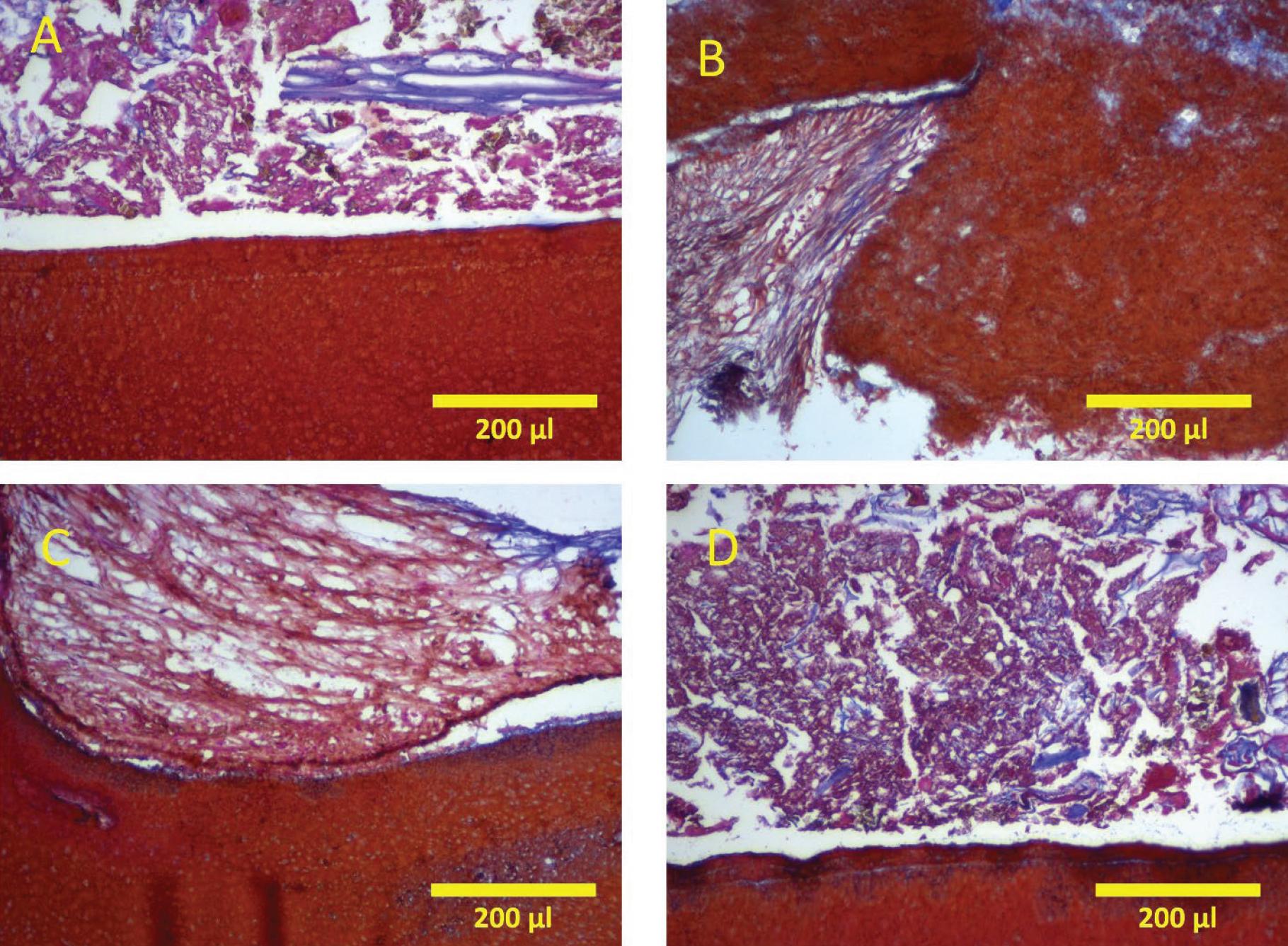 Representative Masson’s trichrome staining images of dental pulp tissues treated with (A) CALDPSC-CURCNPs, (B) CALDPSC, (C) CALALG-CURCNPs, and (D) control group
