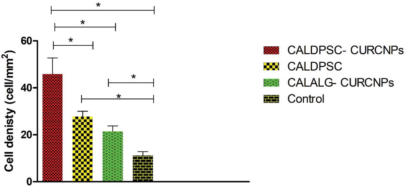 Histomorphometry analysis (Figure 8) showed that cellular density in the pulp tissues treated with CALDPSC-CURCNPs hydrogels was significantly higher than in other groups. The CALDPSC and CALALG-CURCNPs groups had significantly higher cell density than the negative control group.