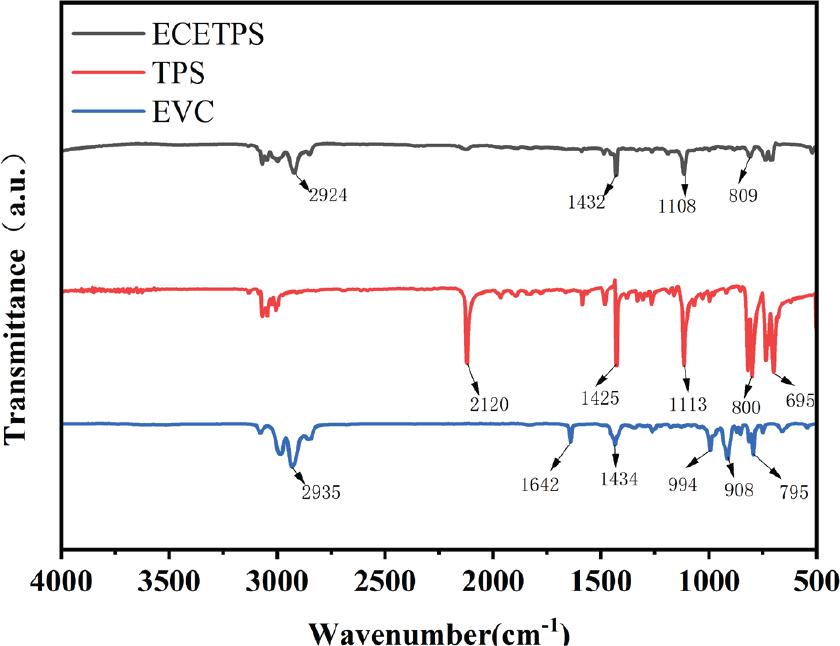 After placing EVC, TPS, and ECETPS into a Fourier Transform Infrared Spectrometer (FTIR) and conducting a test within the wavenumber range of 400–4000 cm−1, we obtained the Fourier Infrared Absorption Spectrum depicted in Figure 4.