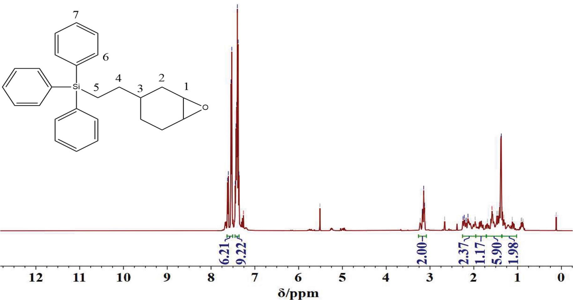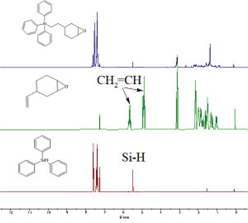 From Figure 5, it can be observed that the carbon-carbon double bonds in 1,2-epoxy-4-vinylcyclohexane have completely disappeared, and the silicon-hydrogen bonds in triphenylsilane have reduced to almost none. This is consistent with the previous Fourier-transform infrared spectroscopy (FT-IR) data, indicating the successful synthesis.