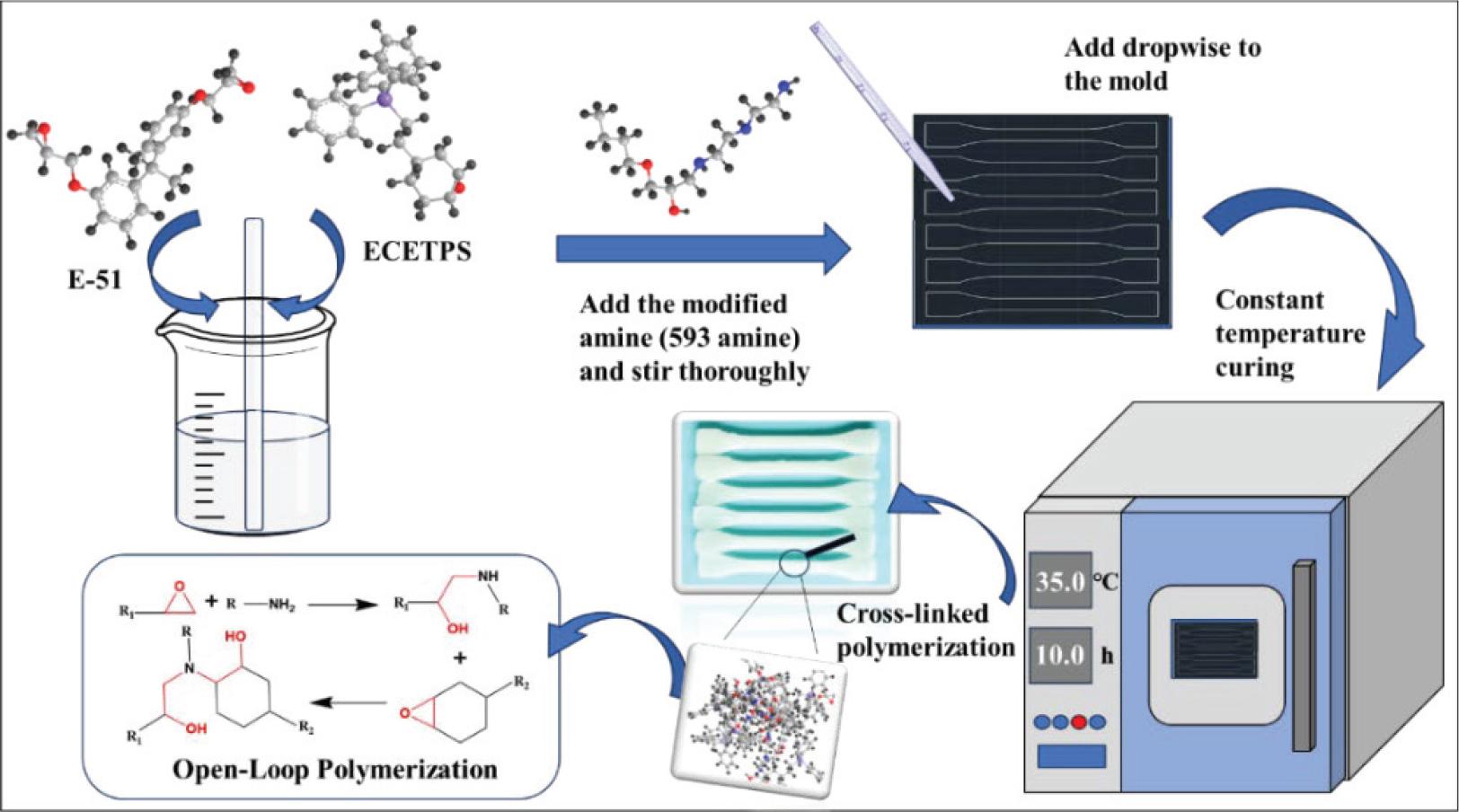 In Figure 7, it can be observed that the prepared samples are dripped into the mold via a dropper and then placed in a constant-temperature oven for curing. Amine curing involves the initial ring-opening polymerization reaction between the epoxy groups in E-51 and the amine groups, followed by the reaction between the epoxy groups in ECETPS and the amine groups, ultimately forming a crosslinked polymer structure.