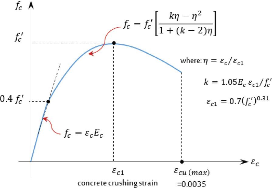 Stress–strain curve equations for the concrete’s compression behavior [34]