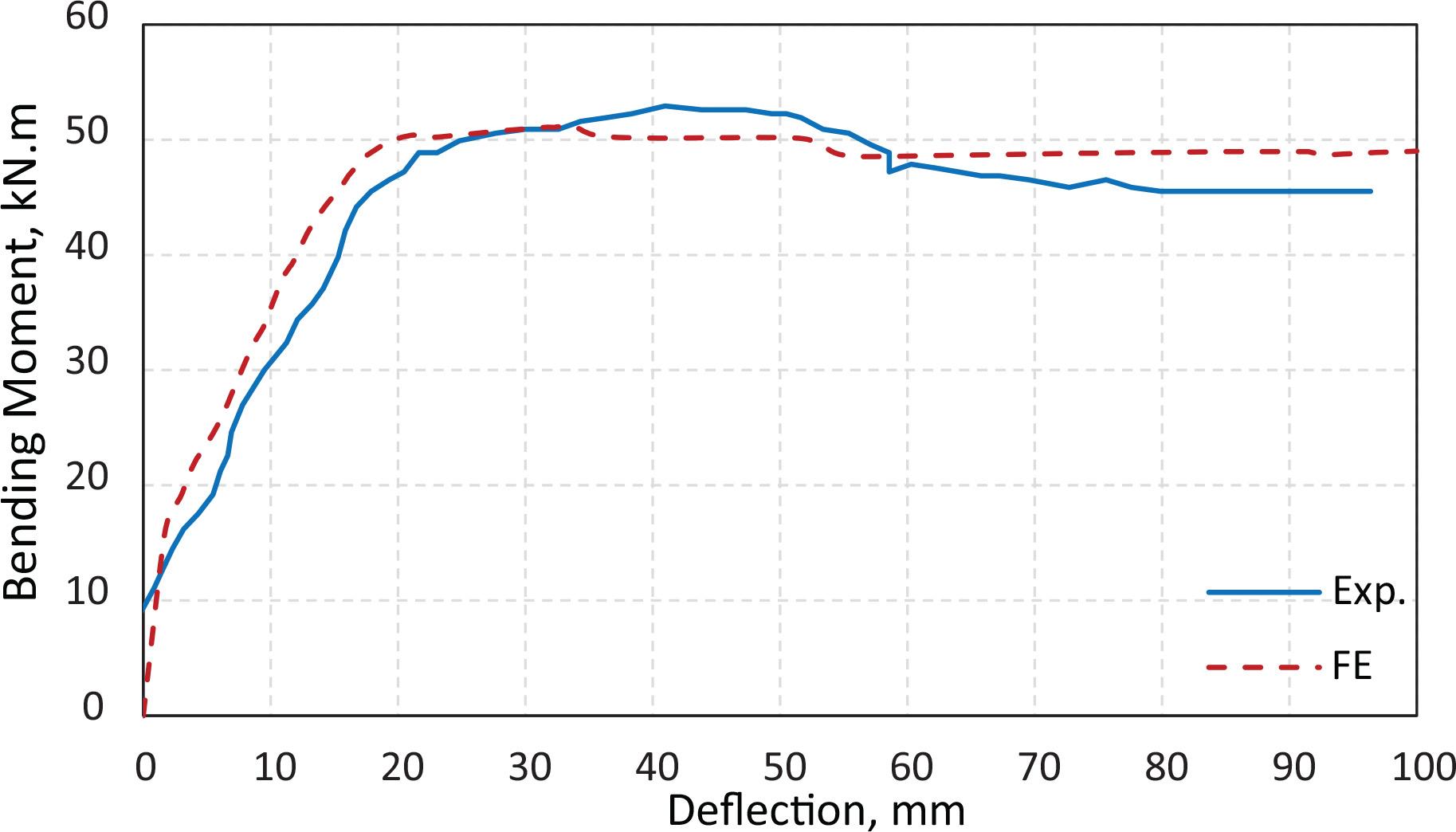 Experimental and FE bending moment–deflection curves of beam H50-100