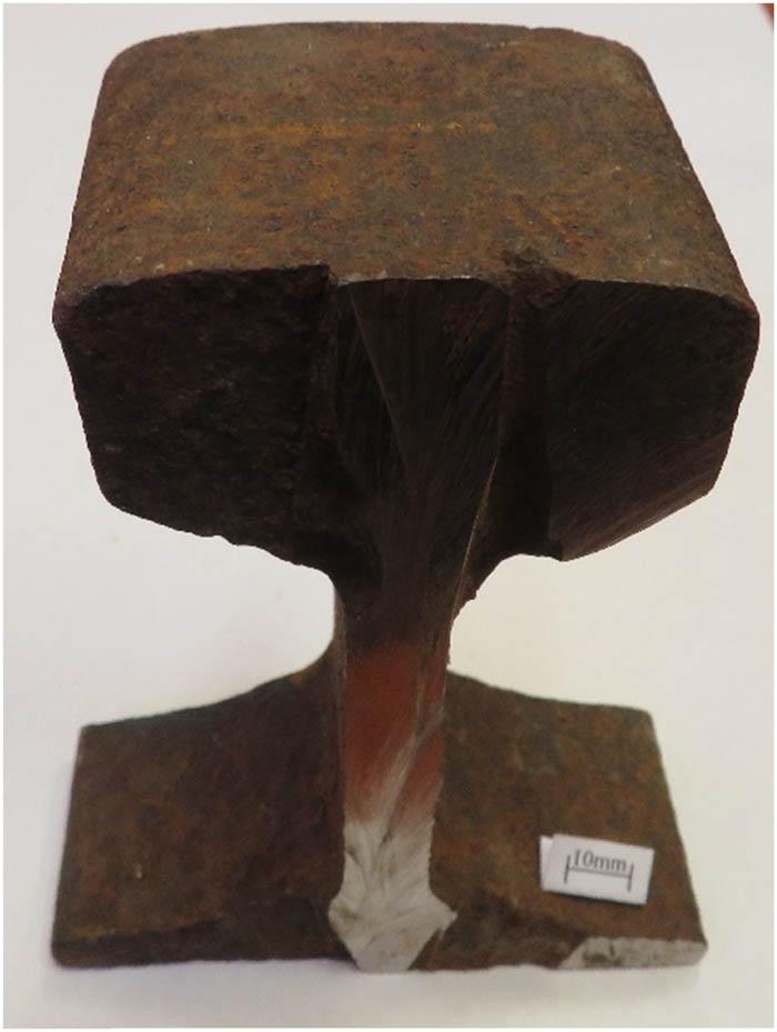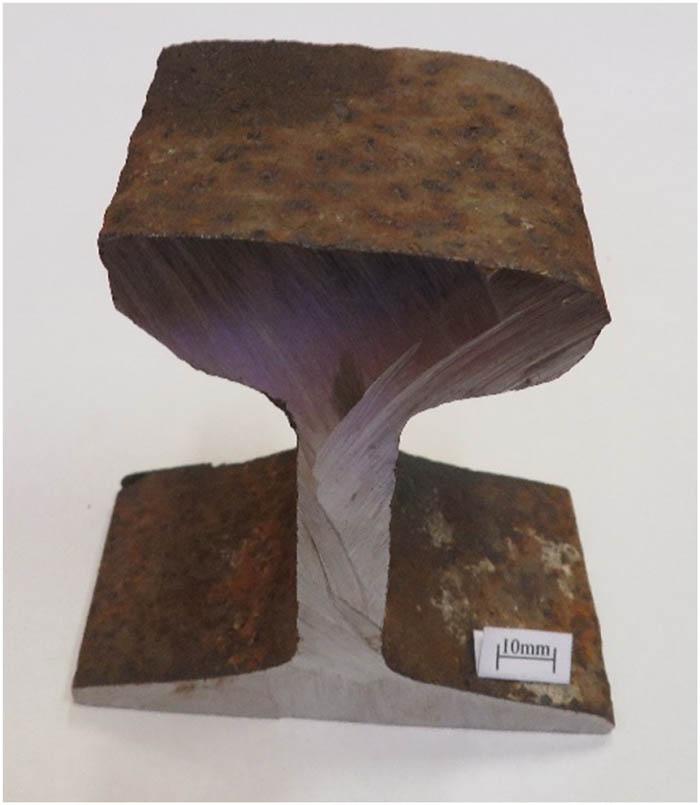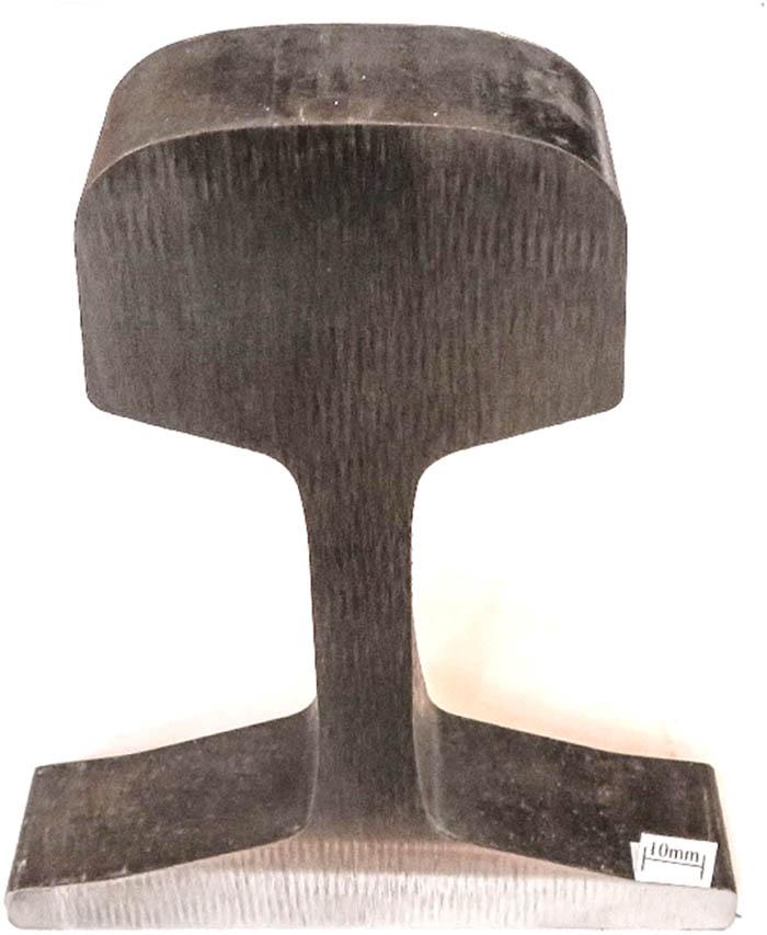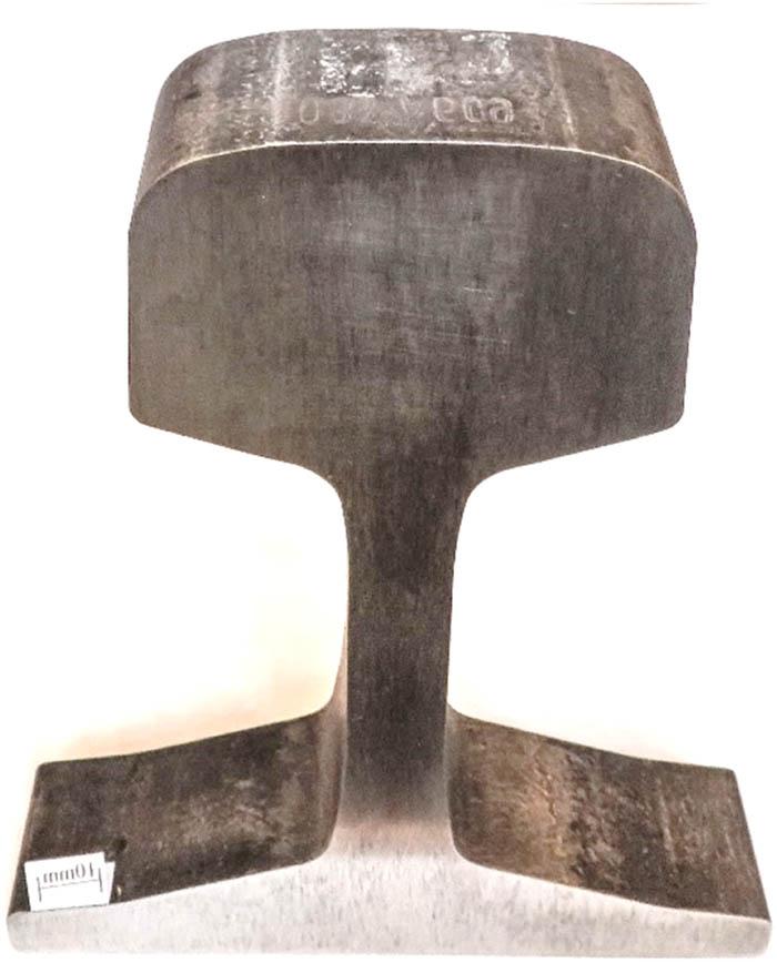 Sections of rails produced at the end of the nineteenth century and modern rails manufactured in two types of steel grades – R260 and heat treated R350HT – were obtained for testing. Table 1 shows the rail manufacturer and year of production. All rails from the nineteenth century are light rails with an estimated height after the production process of 105–130 mm. These rails were used on tracks, with clearly visible loss of material on the rail head and plastic deformation of their running surface as a result of long-term operation; their condition at the time of delivery for testing is shown in Figures 1–4. Modern 49E1 type rails with a nominal height of 149 mm were selected for comparison due to the most similar shape. Samples of the 49E1 rail were delivered for testing after rolling and heat treatment processes; their illustration is given in Figures 5 and 6.