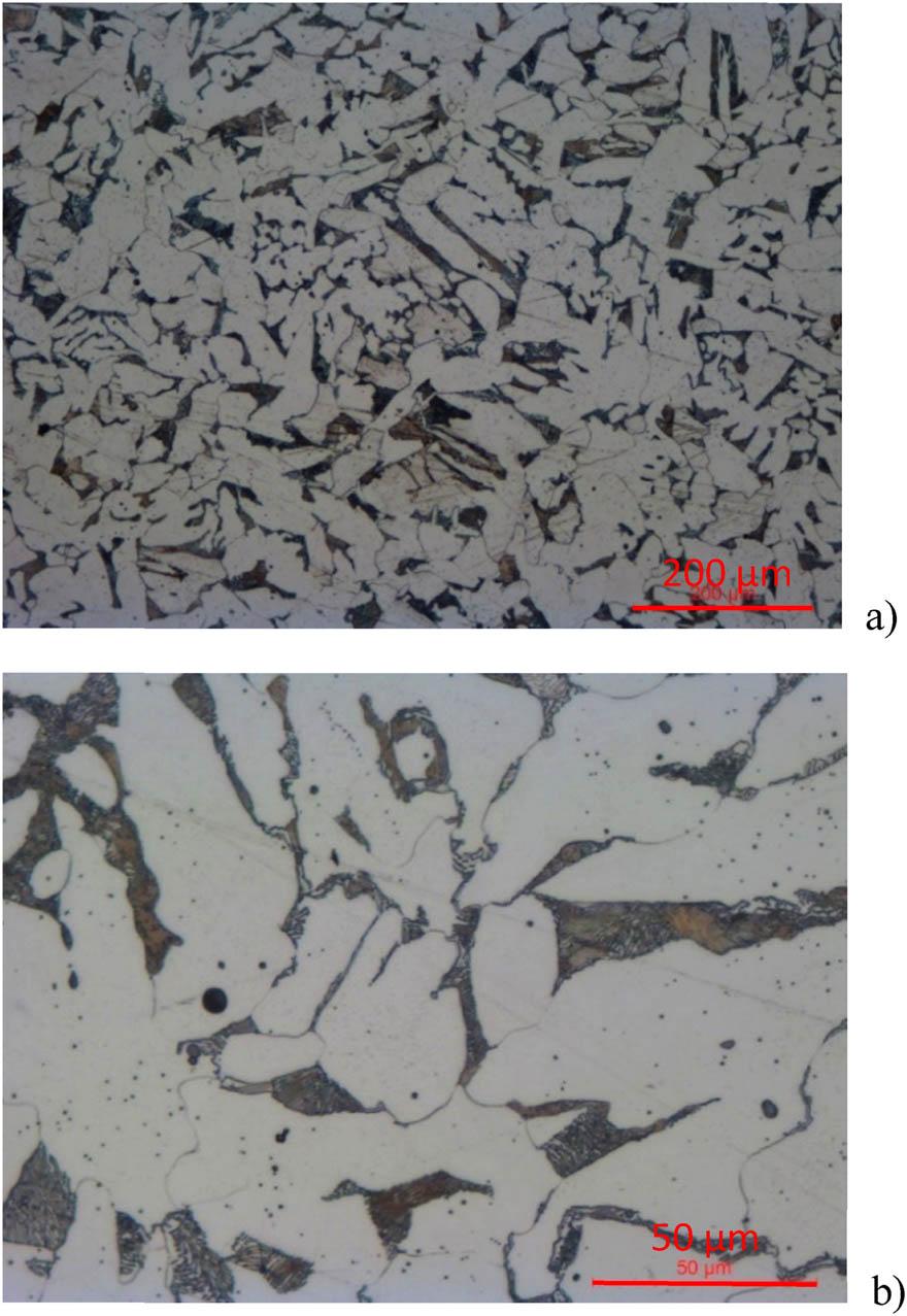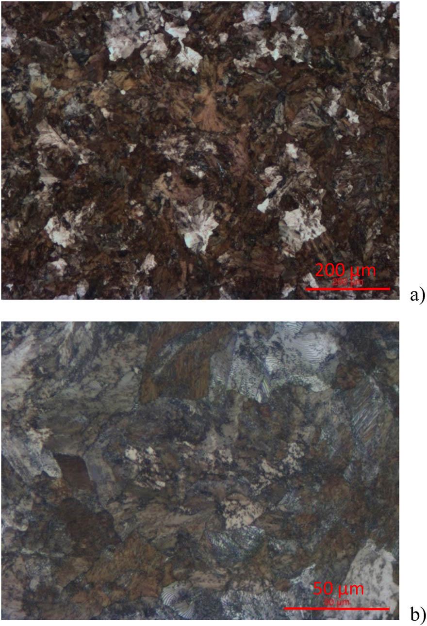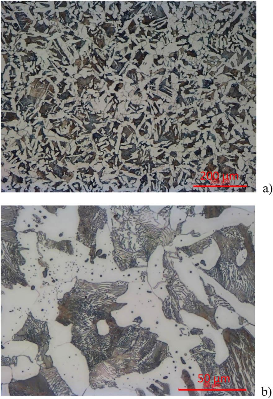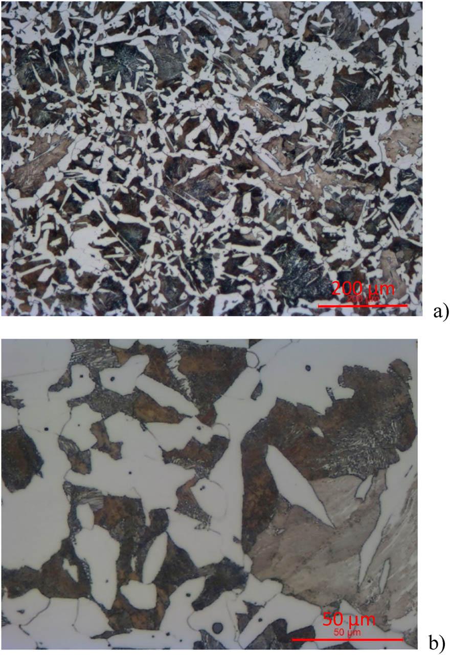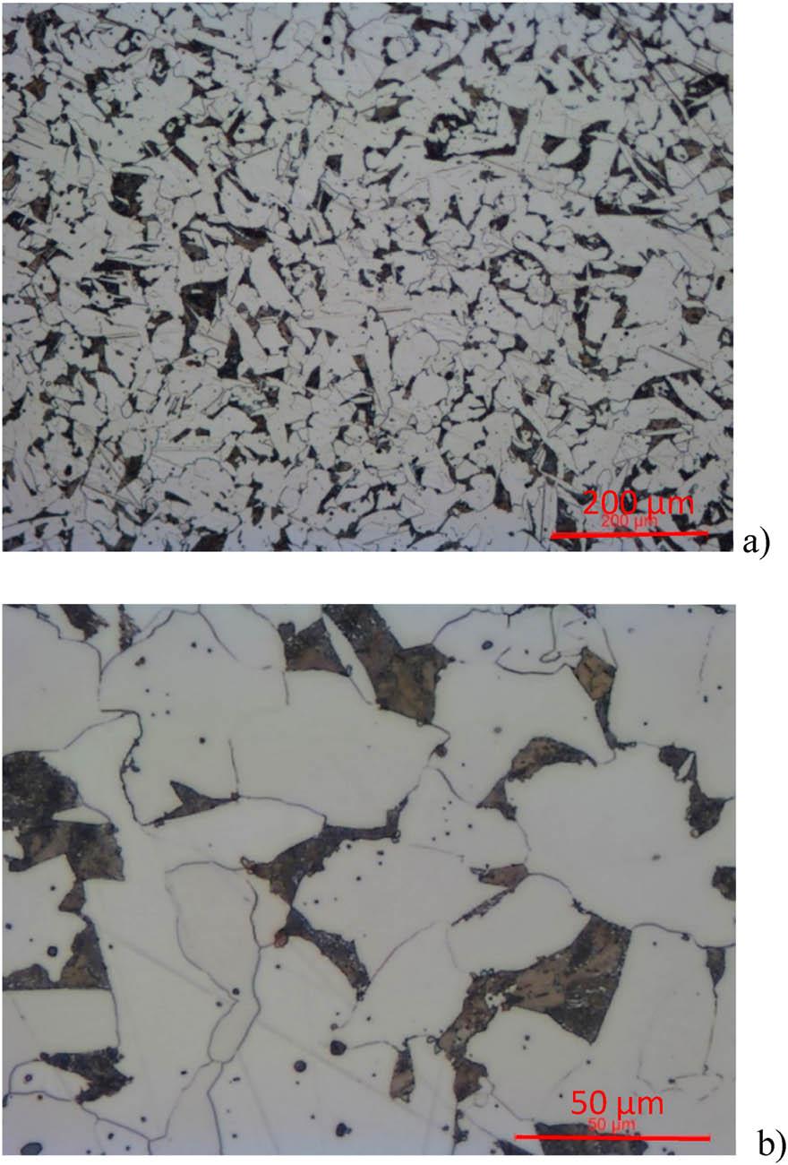 Images of the microstructure of the ferrite-pearlite Krupp rail. a) magn. 100x, b) magn. 500x.