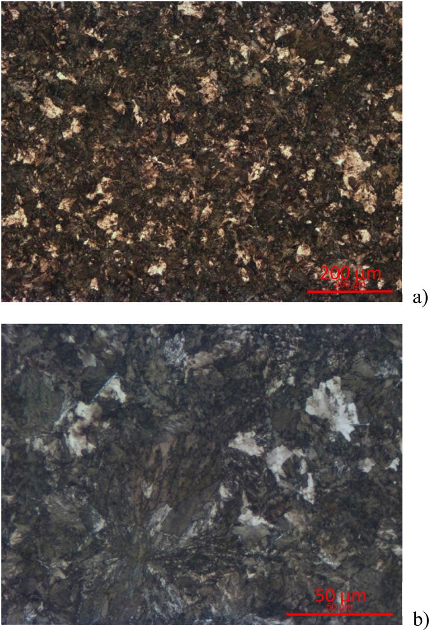 Images of the ferrite-pearlite microstructure of the Aachener Hütte rail. a) magn. 100x, b) magn. 500x.