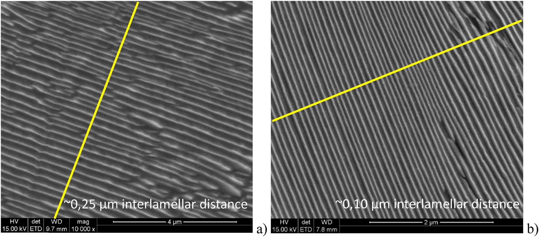 Images of the microstructure of a fine-plate perlite rail of the ArcelorMittal Poland S.A. in the R350HT grade. a) magn. 100x, b) magn. 500x.
