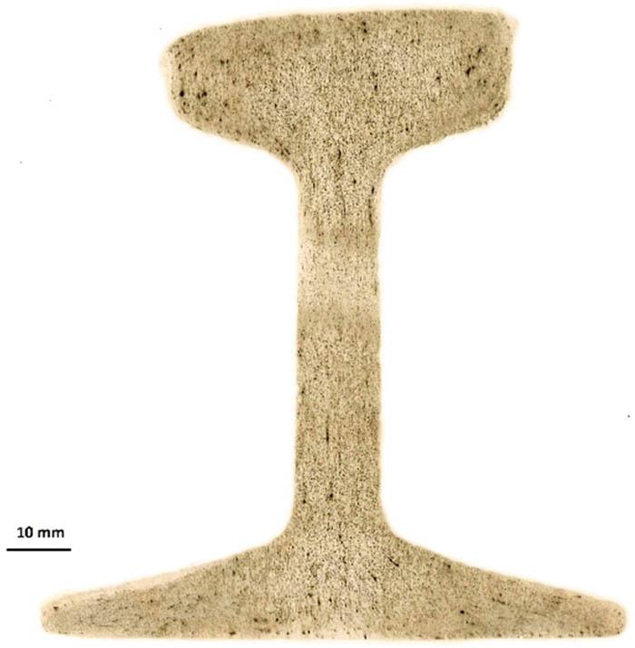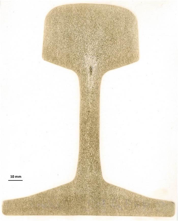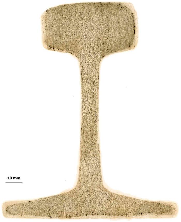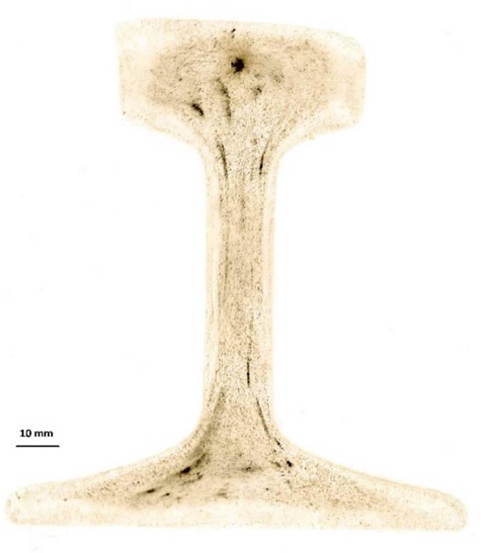 The Baumann print assesses the distribution of sulphur in the form of sulphides on the tested surface of steel products. Baumann prints were made to illustrate the sulphur distribution on the cross-section of the tested rails, which are presented in Figures 14–19.