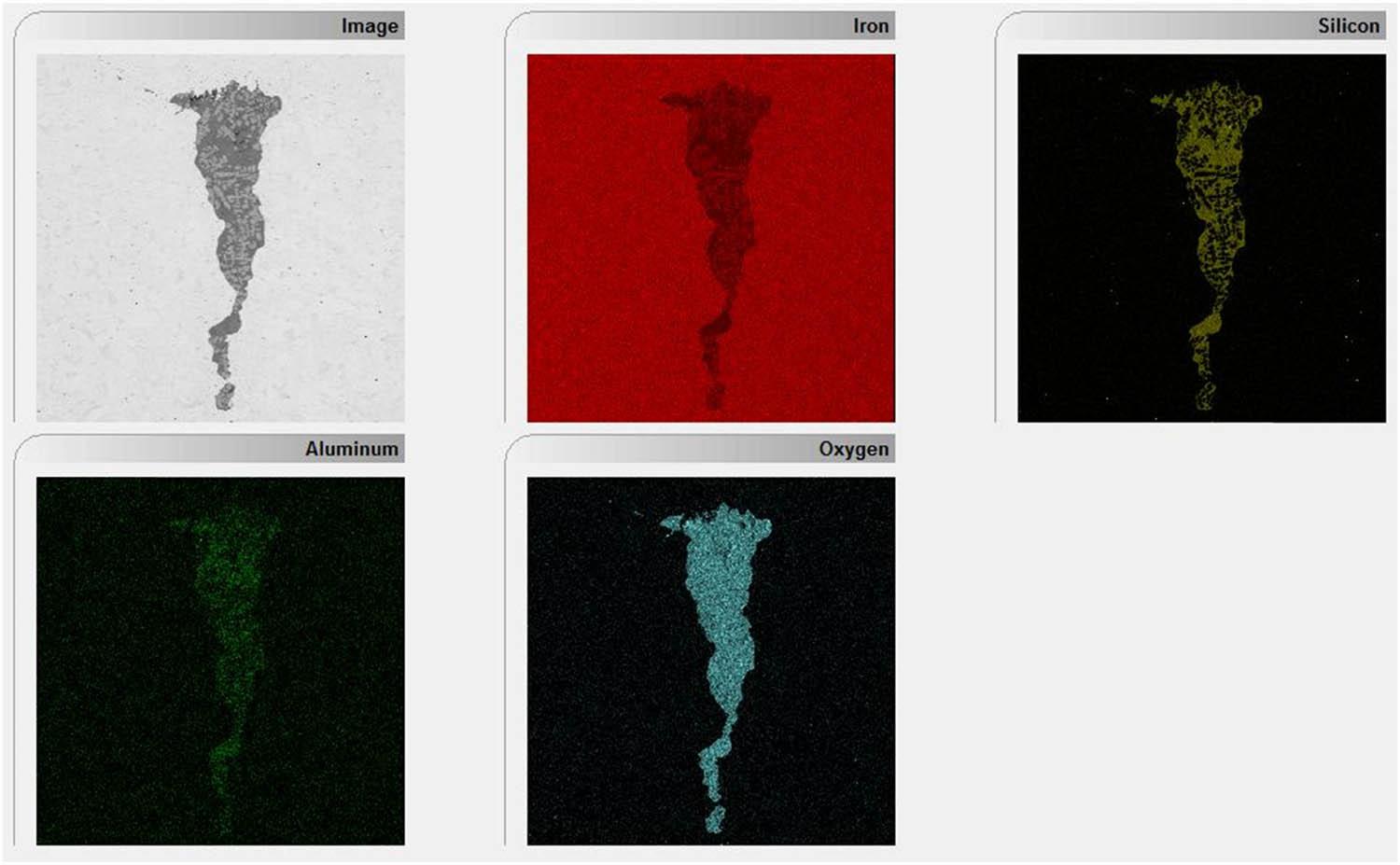 Deep etching reagents intensively etch non-metallic inclusions and widen various types of macroscopic discontinuities in the metal matrix. Therefore, it is possible to reveal various types of defects, such as porosity, pin holes, clusters of non-metallic inclusions, cracks, as well as overlaps and forging laps. It is also possible to assess the primary structure, zones of segregation and dendritic structure. On sample No. 2, this test revealed a crack on the rail foot in an advanced form, propagating from the lower surface of the rail foot, and areas of significant peripheral decarburization in the form of a light rim (Figure 21). Non-metallic inclusion of particularly large size was observed for sample no. 3 (Figure 22). Figure 26 shows an image of an example inclusion. SEM/EDS microanalysis in the area of discontinuity showed the presence of elements such as Fe, O, Si, and Al (Figure 27). The chemical composition indicates a two-phase structure composed of silicon oxides SiO2 and aluminium oxides Al2O3. The image of sample No. 1 after deep etching shows a peripheral decarburization zone and segregation, which is more intensely observed on sample No. 4 along with large clusters of non-metallic precipitations. Sample Nos 5 and 6 show the correct macrostructure without defects with visible traces of sulphur segregation occurring in the node at the transition between the rail web and the rail head.