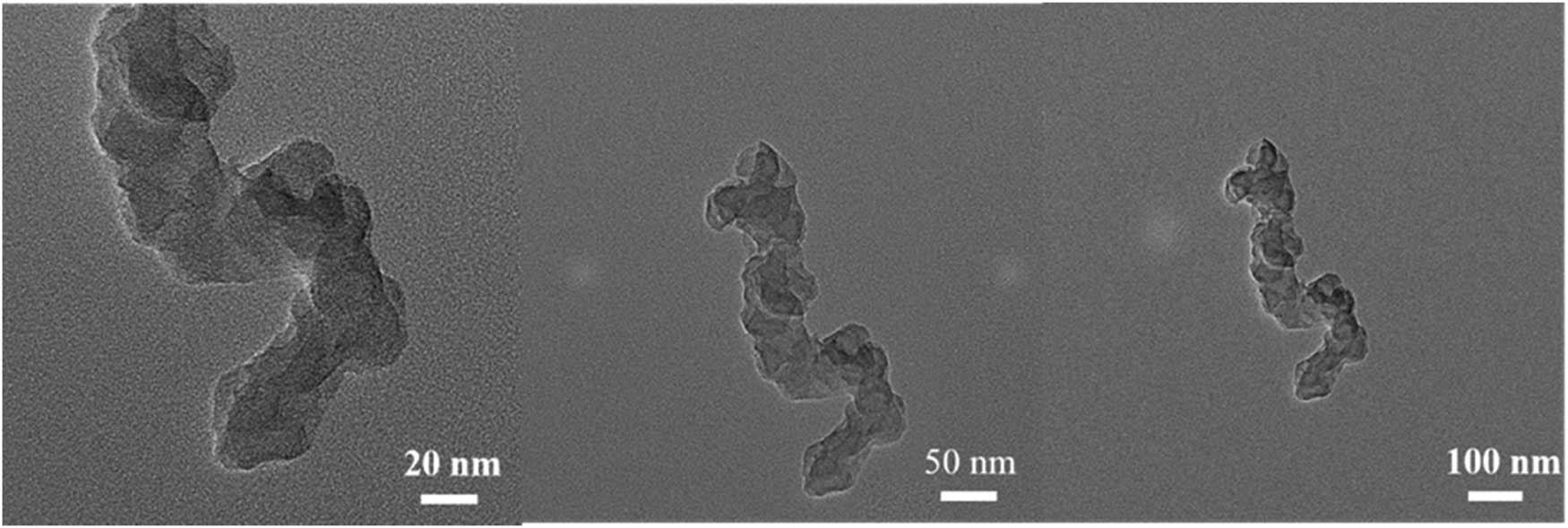 Scanning image of the catalyst using a TEM is shown in Figure 2. Catalyst morphologies with sizes of 20, 50, and 100 nm were presented, respectively. It can be seen that the average size of the catalyst particles is 20–40 nm, indicating that they are smooth without edges and present a stacked shape.