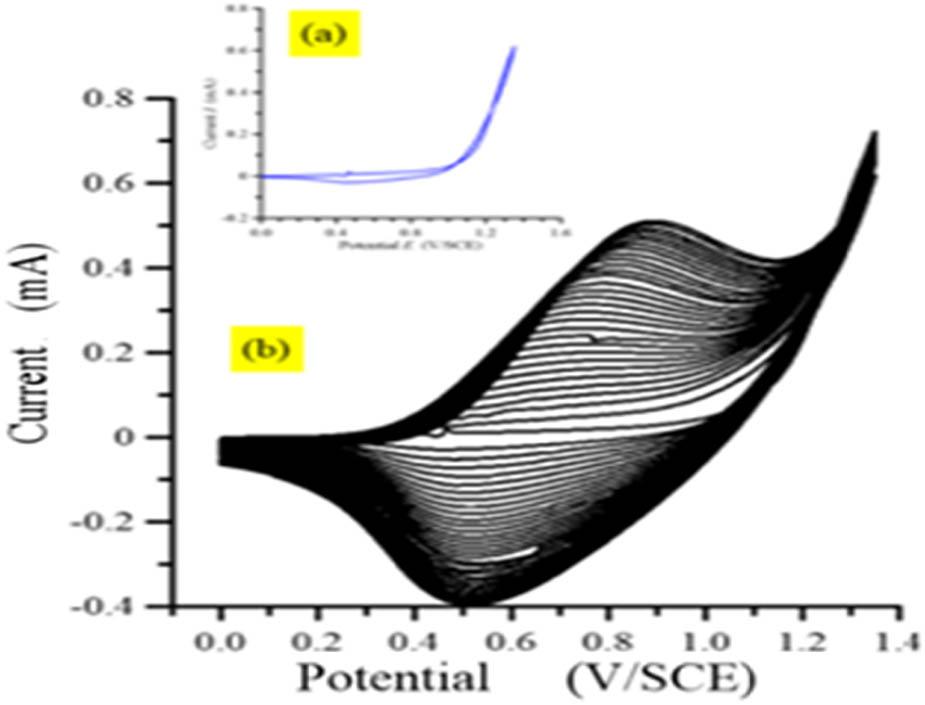 Cyclic voltammetry curves of the monomer on an FTO/glass electrode recorded from a solution containing 4 × 10−3 M monomer, 10−1 M acetonitrile, and 10−1 M LiClO4, at the scanning speed of υ = 100 mV/s. (a) First run and (b) successive scans.