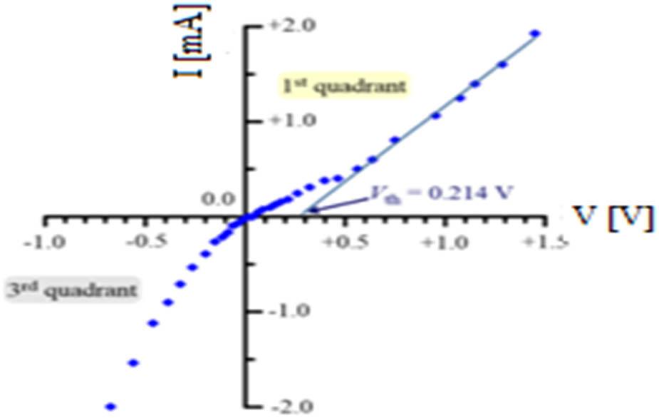 The reverse saturation current of such configuration was also determined by using the characteristic I(V) in a semilogarithmic scale (third quadrant). This is shown in Figure 10. Extrapolation of the linear part to V = 0 yields a reverse saturation current I s = 0.22 mA. These parameters (V th and I s) are very appropriate for low power electronics applications [22,23,24].