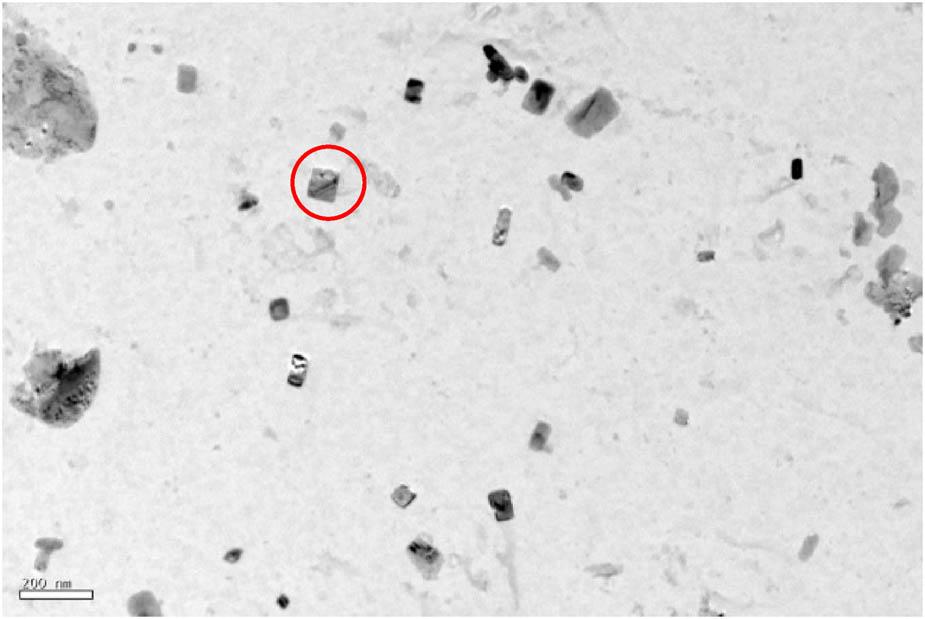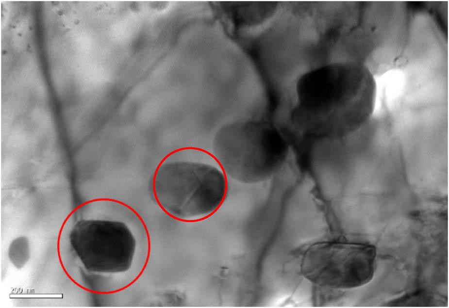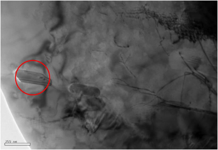 MX is a nanophase, dispersed within the crystal, with the main forms being spherical, square, rectangular, hexagonal, rod-shaped, and strip-like, as shown in Figures 7–9. Compared to M23C6, MX has a smaller size and higher stability. It is not easy to grow after long-term operation at high temperatures, and its strengthening effect would not weaken with time. MX has a significant pinning effect on dislocations in martensite, making a long-term and outstanding contribution to the stability and creep fracture strength of martensitic steel.