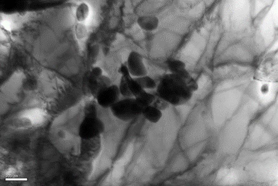 These abnormal structures are not usually caused by long-term high temperature use, so special attention should be paid during aging rating. In some cases, they have reached the state of “severe aging” before use or at the beginning of use [27]. For example, a factory conducted metallographic inspection on P92 pipes during infrastructure construction and found that its lathing martensite morphology disappeared and polygonal block ferrite and large size precipitated phase appeared, as shown in Figures 17 and 18. Figures 19 and 20 show the microstructure morphology of the P92 pipe base metal under a transmission electron microscope, which is consistent with the observation results obtained under a light microscope. Equiaxed ferrite can be seen, and dislocation is disappeared. These phenomena indicate that serious recovery and recrystallization have occurred in this part. Tissue aging has occurred without operation.