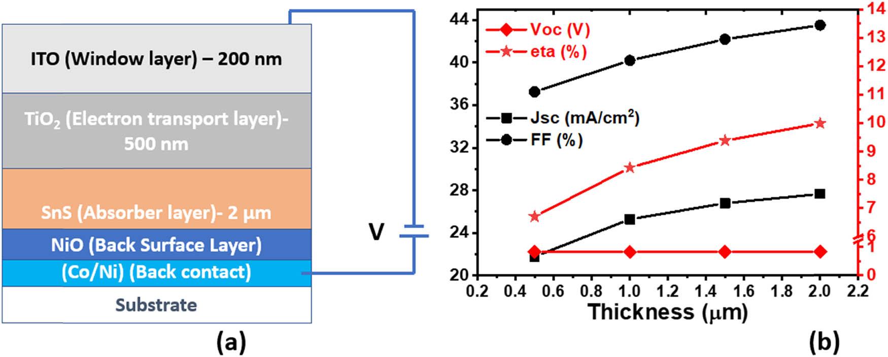 (a) Structural representation of a solar cell device based on SnS, TiO2, and ITO. (b) Adjustment of solar cell parameters (J SC, V OC, ɳ, and fill factor) with the thickness of SnS.