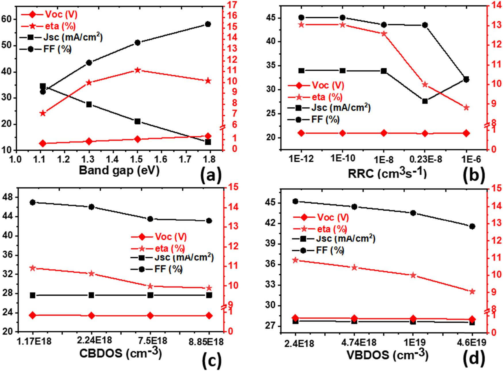 Variations in the parameters of a solar cell (J SC, V OC, ɳ, and fill factor) with (a) band gap, (b) radiative recombination coefficient, (c) CBDOS, and (d) VBDOS of SnS.