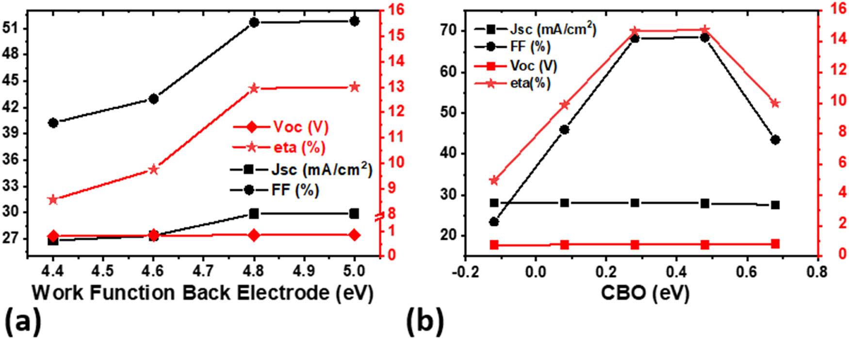 (a) Variations in parameters of solar cells with the work function of back contacts and (b) CBO.