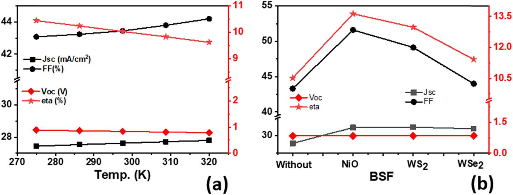 Variation in the cell parameters with (a) operating temperature and (b) without and with BSF layers.