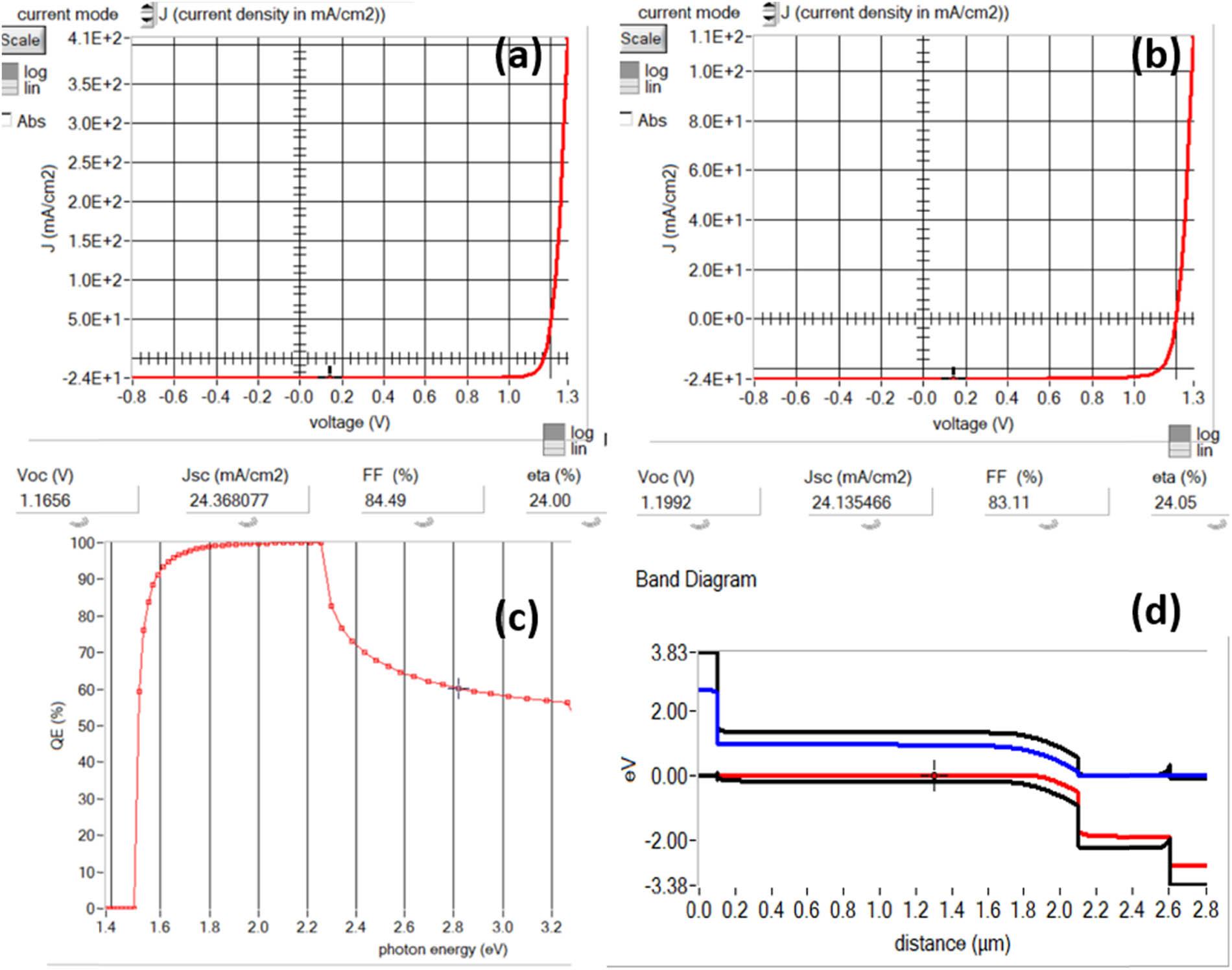 With optimized parameters, the solar cell showed efficiencies of 24.00% at 300 K operating temperature and 24.05% at 275 K (Figure 5a and b). Quantum efficiency seems to reach 100% for the visible region (550–750 nm) for this structure (Figure 5c), and energy band alignment is shown in Figure 5d. A list of optimized parameters is shown in Table 2.
