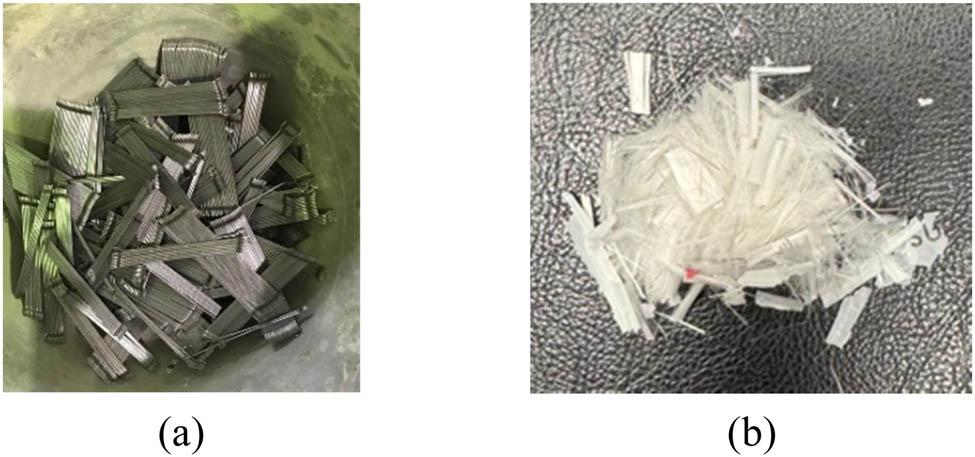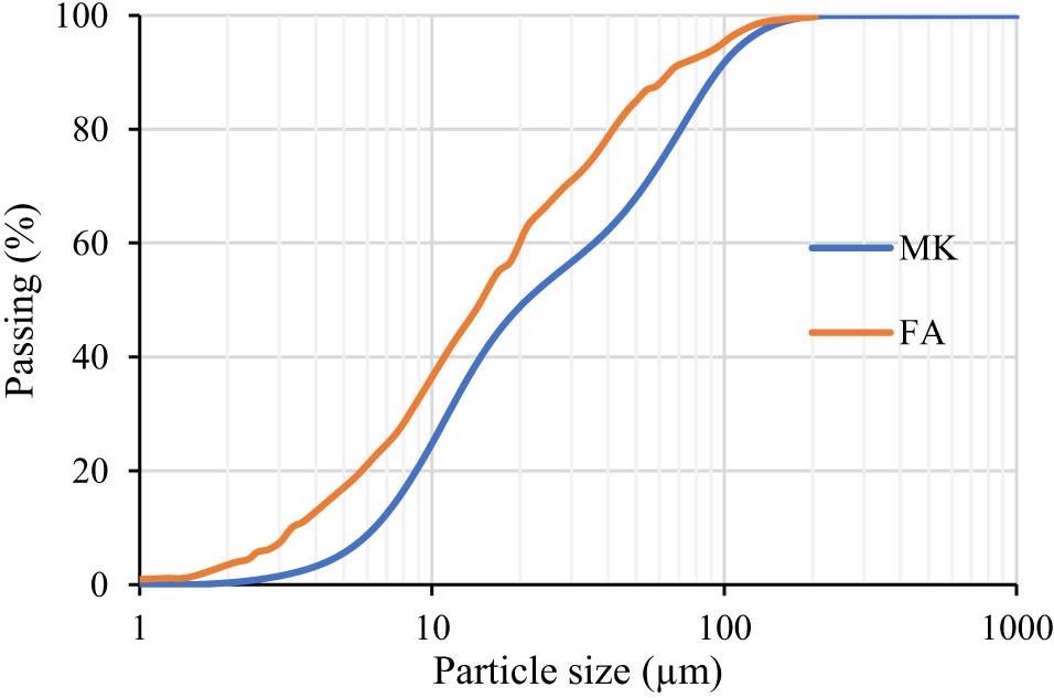 The primary component employed in this investigation was MK, which was obtained from kaolinitic soil samples collected from a deposit in the Riyadh region (Saudi Arabia) and then treated at 750°C for 3 h. The investigation used a particle size analyzer machine to obtain the particle sizes of MK and FA, as illustrated in Figure 1. The MK’s chemical composition is shown in Table 1. The GPC mix utilized fine and coarse aggregates, with crushed limestone (max size: 10 mm) as the coarse aggregate and a blend of crushed limestone (max size: 4.75 mm) and white sand (max size: 2 mm) as the fine aggregate. The GPC binding agent was activated using a sodium-based activator comprising sodium silicate (Na2SiO3) solution and sodium hydroxide (NaOH) solution. The NaOH solution with a concentration of 14 M was produced 1 day prior to preparing the specimen. The Na2SiO3 solution possessed a silica modulus of 3.3, representing the ratio of SiO2 to Na2O. The mix used for the production of fiber-reinforced concrete incorporated two varieties of fibers: (i) PVA fibers (PVA with a chemical formula (C2H4O) n ) and (ii) hooked-end SFs, sourced from KURARAY Co., Ltd, Japan, and Ganzhou Daye Metallic Fibres Co., Ltd, China, respectively. Figure 2 and Table 2 depict the characteristics of the two fiber types (i.e., PVA and SF) employed in the investigation. The FA utilized in this experimental work was classified as Class F according to ASTM C618 [21].