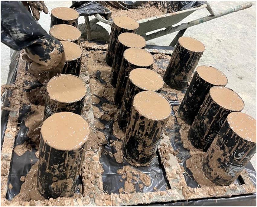 The aggregates of all mixtures were used in the saturated surface dry phase and then subjected to a dry mixing process with MK for a duration of 2 min. The mixed alkaline solutions (NaOH and Na2SiO3) were added into the dry concrete constituents. The mixing process continued for several minutes until the mixture reached a homogeneous state. In the preparation of MS and MSP mixtures, fibers were incorporated into the mixture, and the mixing process was maintained for a minimum duration of 4 min. GPC was gradually poured into the molds to minimize separation and prevent void formation, utilizing a vibrating table for this purpose. Figure 3 illustrates the process of GPC vibration during casting in molds. The uppermost layer was carefully leveled with a steel trowel to ensure a uniform surface. The specimens were cured for a duration of 28 days under laboratory conditions, within an ambient temperature of 24 ± 2°C and a relative humidity of 20 ± 2%. Table 4 presents the test specimen matrix utilized in this study. Moreover, Table 4 employs the abbreviations “M0,” “MS,” and “MSP” to denote different types of GPC mixtures: M0 represents control GPC mixtures without fibers, MS GPC mixtures with SFs, and MSP GPC mixtures with hybrid fibers (i.e., SF + PVA). The specimen identifiers comprised alphanumeric characters. The initial string refers to the specific GPC mixtures used. The designations “25,” “300,” and “500” indicate the specimens subjected to temperatures of 25, 300, and 500°C, respectively.
