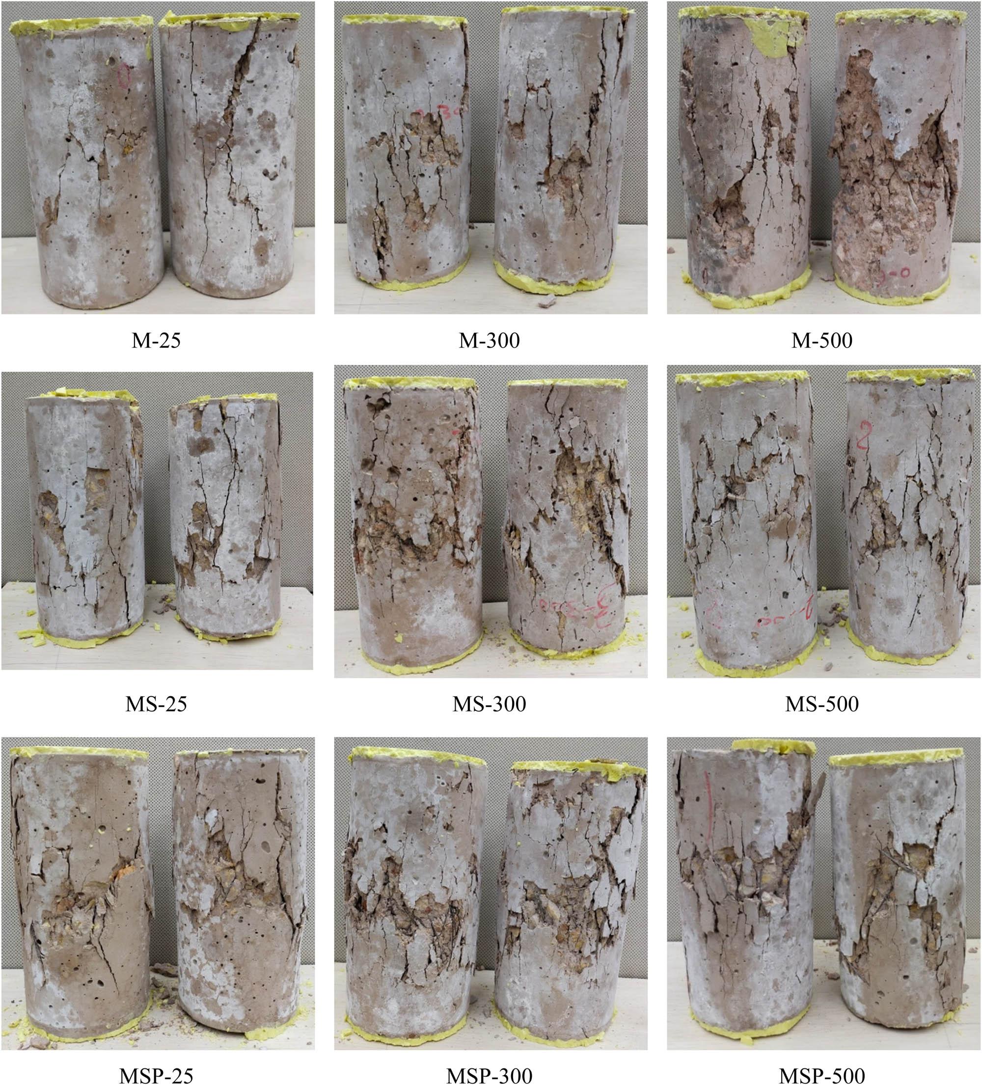 Figure 6 illustrates the prevalent failure patterns observed in all GPC specimens following compression testing and exposure to temperatures of 25, 300, and 500°C. Significantly, none of the examined GPC specimens subjected to varying degrees of heat temperatures (300 and 500°C) exhibited obvious corner fracture or spalling. Furthermore, no significant cracks were observable even after exposure to higher temperatures reaching 500°C. The control specimens (i.e., those without fibers) underwent brittle failure due to concrete crushing, as shown in Figure 6. Upon exposure to elevated temperatures, the heated control specimens (i.e., those without fibers) exhibited a diminished propensity for brittle failure. The concrete cover exhibited initial indications of spalling. Consequently, a failure occurred when the axial load began to decrease, in contrast to specimens of the same type that were exposed to a temperature of 25°C. When exposed to temperatures of 300 and 500°C, surface cracking due to heating was visible on the GPC specimens without fibers. GPC specimens without fibers exhibited significant cracking with the increase of temperature, characterized by noticeable fragmented fissures that did not detach completely. The matrix structure of heated specimens without fibers became brittle, exhibiting numerous cracks and a larger peeling area compared to those with fibers. Generally, the failure pattern observed in the heated specimens closely matches with that of the unheated specimens. Compared to the unheated specimens, the heated specimens showed more fracture and crashing. This can clarify why the compressive strength of heated specimens did not exceed that of specimens at ambient temperature. GPC specimens exhibited higher rates of cracks and fractures when exposed to a temperature of 500°C compared to those exposed to 300°C, as illustrated in Figure 6. The exposure to temperatures of 300 and 500°C led to the occurrence of thermal cracking on the specimens’ surfaces. Generally, the failure sound was lower for the heated specimens, whereas the unheated specimens made a loud sound, like a small explosion, when they failed. As a result, there was no abrupt failure, unlike specimens of the identical type subjected to ambient temperature. Furthermore, Albidah et al. [24] found no large cracks even when exposed to elevated temperatures of up to 600°C, which is consistent with previous research findings. The M-25 specimen exhibited significant cracks and crushing, first observed at the load application area and later progressing toward the specimen’s midpoint. The MS-25 and MSP-25 cylinders showed different patterns. Surface thermal cracks were still present, but the fibers in the mixtures significantly decreased their occurrence. The specimens incorporating SF (i.e., MS-25) demonstrated reduced crack widths relative to that of the M-25 specimen, as depicted in Figure 6. Substantial parts of concrete remained detached but had not yet fallen, showing that the fibers served a protective function against cracking following elevated temperatures. Elsanadedy et al. [25] reported that adding SF and hybrid fibers (SF + PVA) to the GPC mixture facilitated the bridging of cracks. These outcomes agree with the findings of the current study. At high temperatures, the GPC specimens containing fibers showed significant peeling on their middle surfaces, indicating a diminished bonding strength between the GPC matrix and SFs. However, the inclusion of fibers modified the failure mode of GPC specimens, changing it from a brittle to a ductile state by enhancing the mixture’s toughness, aligning with previous research findings in cement concrete and GPC [26]. GPC specimens without fibers often fail in a way that is either brittle or explosive. Specimens with fibers, on the other hand, were less brittle and explosive due to the arbitrary distribution of fibers inside the GPC matrix. The failure behavior of specimens exposed to heat that contained SFs exhibited increased ductility. The enhanced ductility may be attributed to the bonding influence between the concrete matrix and SF, which reduced the crack propagation and formation while maintaining load resistance at the cracks. The presence of fibers mitigated the negative effects of increased porosity following evaluated temperatures, reduced the crack size, and enhanced the strength. The failure mechanism of heated GPC specimens with hybrid fibers (SF + PVA) exhibited features similar to those of cylinders containing SFs.