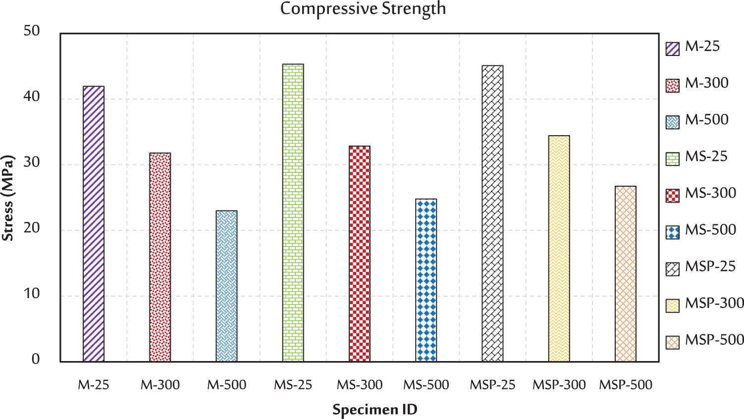 Figure 7 demonstrates the difference in compressive strength at ambient temperature and 300°C. The compressive strength of heated specimens decreased by 24.2, 27.5, and 23.6% for M-300, MS-300, and MSP-300, respectively, in comparison to the unheated specimens M-25, MS-25, and MSP-25. The deterioration rate of the compressive strength diminished with the addition of fibers (i.e., SF or SF + PVA). The decrease in compressive strength of GPC exposed to elevated temperatures is attributable to the disparity in expansion during heating between the GPC matrix and aggregate, causing cracks and degradation of the bond at the aggregate–paste interface, as highlighted by Kong and Sanjayan [35]. Furthermore, when exposed to 300°C, water present within the GPC matrix migrates to the external surface of heated specimens and subsequently evaporates. This procedure predominantly transpires within the temperature range of 100–300°C, and beyond that point water evaporation decreases, and the reduction rate of strength deterioration decreases with higher temperatures [13]. Moreover, this procedure leads to the degradation of the internal microstructure and a reduction in compressive strength [13]. As reported by Albidah et al. [26], the SEM examination indicated that the micrographs obtained after heating at 400°C exhibited an approximate porosity and a sponge-like structure in the GPC mixtures, which contributed to the reduction in strength. Following the exposure of GPC specimens to a higher temperature of 500°C, a similar trend was observed in the specimens heated to 300°C. The compressive strength of heated specimens decreased by 45.2, 45.3, and 40.7% for M-500, MS-500, and MSP-500, respectively, in comparison to the unheated specimens M-25, MS-25, and MSP-25. The results of this study confirm the viability of MK–FA-based GPC as a substitute for the traditional Portland cement-based concrete. Research demonstrates the feasibility of achieving compressive strengths that are comparable to or slightly exceeding the values of conventional concrete.