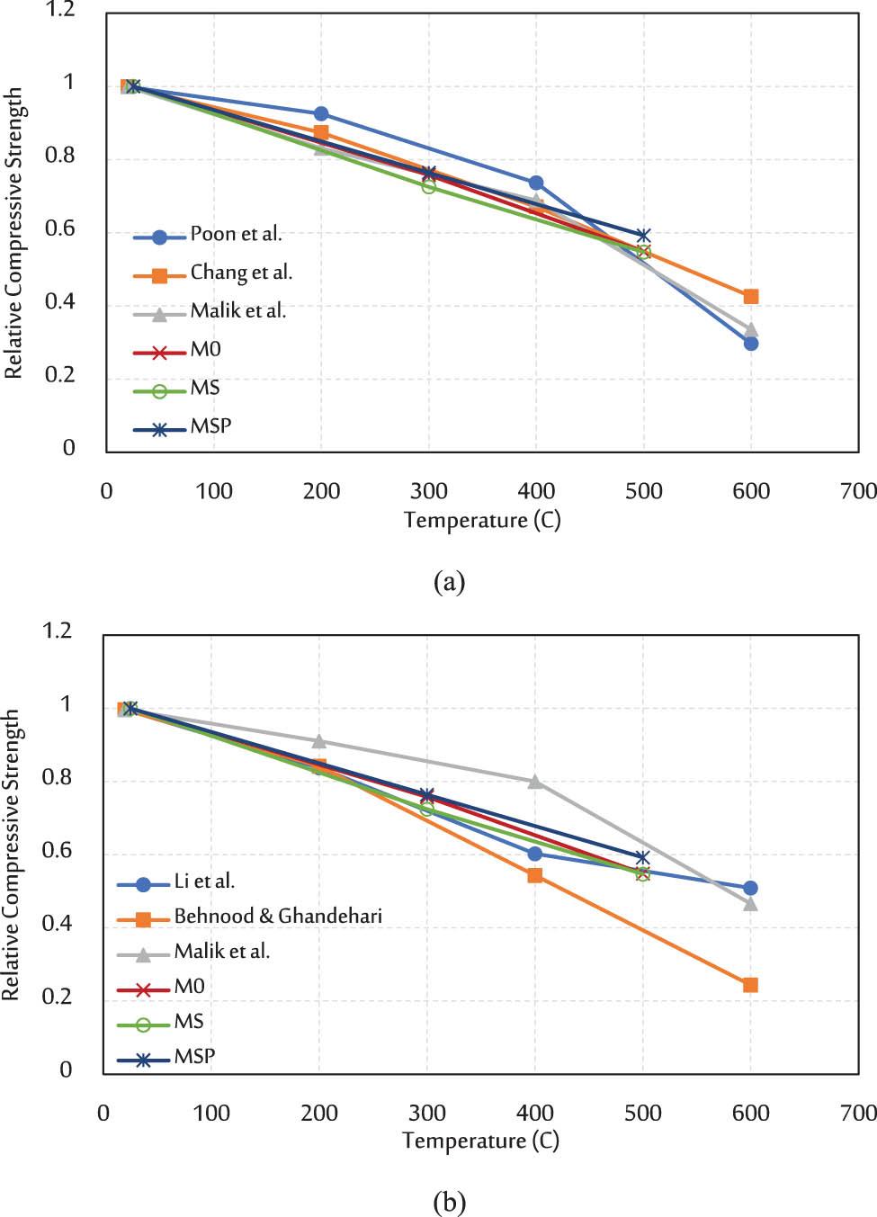 Figure 8 illustrates the fluctuation of concrete’s relative compressive strength in relation to temperature for the current study results (M0, MS, and MSP curves) compared to previous studies [36,37]. The same trends were noticed in the strength loss for the normal strength concrete specimens (Figure 8a). However, the GPC specimens exhibit superior resilience to fragmentation in comparison to normal-strength concrete specimens. A slight superiority was noticed for the GPC specimens compared to high-strength concrete specimens (Figure 8b). The variations in material composition due to regional availability, historical curing temperatures, curing cycles, concrete age, and the utilization of diverse furnace types complicate the provision of a generalized interpretation.