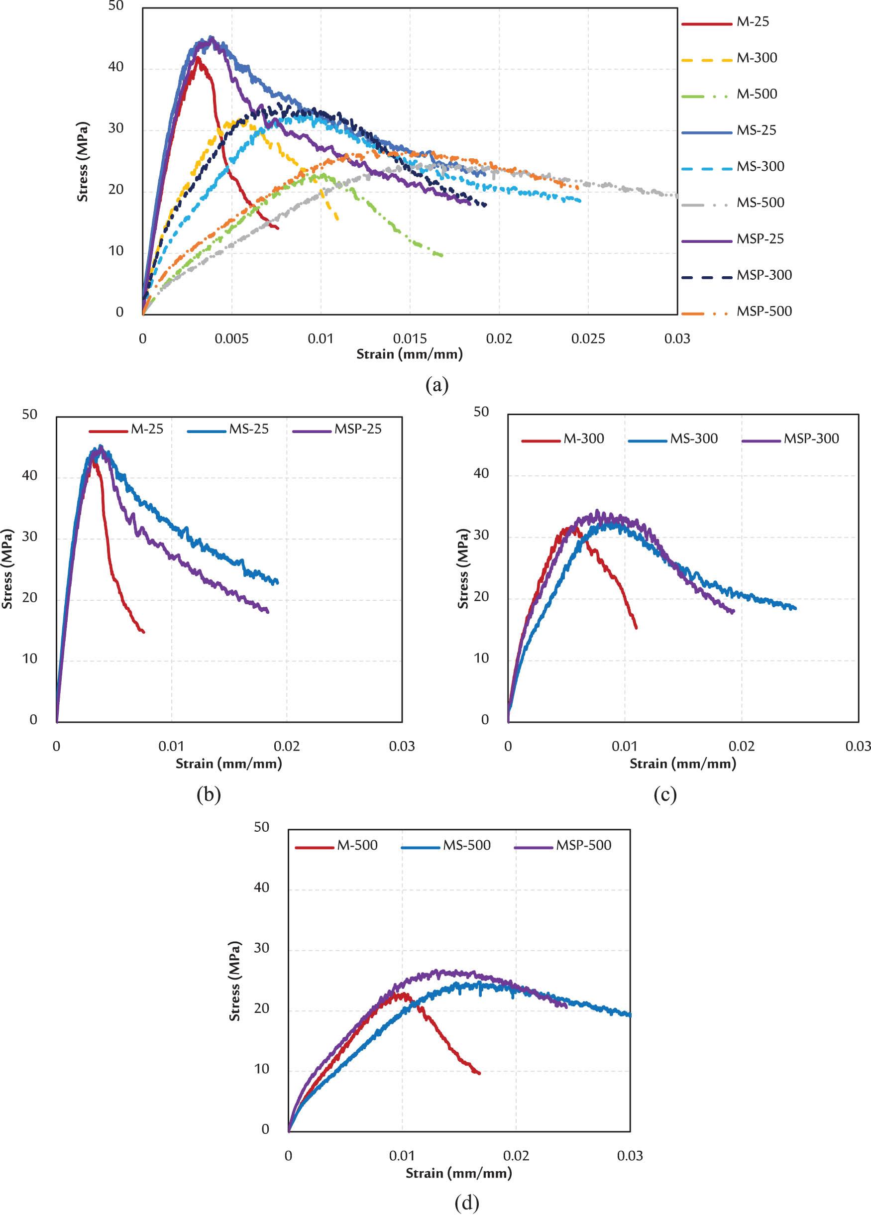 The compressive strength of heated and unheated GPC specimens is shown in Table 5. A comparison was made to evaluate the contribution of fibers to compressive strength following exposure to high temperatures (300 and 500°C). This details the strength retained by concrete after being subjected to elevated temperatures in comparison with its strength at 25°C (ambient temperature). The findings revealed that the addition of fibers has a considerable effect on compressive strength, independent of the fiber type employed. The incorporation of fibers effectively minimized the reduction in compressive strength observed after exposure to high temperatures (300 and 500°C) when compared to GPC mixtures lacking fibers. The reduction in the compressive strength of heated specimens containing fibers exposed to 300°C is less compared to that of the control GPC specimen. MS-300 and MSP-300 demonstrated ratios of 21.7 and 17.9%, respectively, while M-300 had a reduction ratio that reached 24.2% when compared to the M-25 specimen. The compressive strength of heated specimens for M-300, MS-300, and MSP-300 was, respectively, 24.2, 27.5, and 23.6% lower than that of their unheated specimens, M-25, MS-25, and MSP-25. The specimens exposed to 500°C demonstrated the same tendency. The compressive strength of heated specimens for M-500, MS-500, and MSP-500 was, respectively, 45.2, 45.3, and 40.7% lower than that of their unheated specimens, which were M-25, MS-25, and MSP-25. The increase in temperature from 300 to 500°C resulted in a significant deterioration of pressure resistance. Specifically, the decrease at 300°C reached 27.5%, whereas the decrease at 500°C reached 45.3% when compared to their unheated specimens. Table 5 indicates that the MS-25 specimens exhibit the highest peak stresses among all the specimens analyzed. Furthermore, MSP-25 exhibited similar peak stresses, demonstrating a minor decrease of 0.5% in comparison to the MS-25 specimens. The fibers (SF and SF + PVA) significantly enhanced the GPC specimens’ resistance to heating. Despite the exposure to temperatures of 300 and 500°C, the impact of fibers clearly exceeded that of the control mixture in the examination of the post-peak response of the curves, as illustrated in Figure 9. Furthermore, SFs can withstand high temperatures. The function of crack bridging reduces the propagation and formation of fractures, allowing the concrete specimens to consistently endure axial stresses, even in the existence of cracks [44–46]. Although PVA fibers are shorter and have a lower Young’s modulus compared to SFs, they are capable of bridging microcracks, as demonstrated in previous work (e.g., the study of Zhang et al. [47]).
