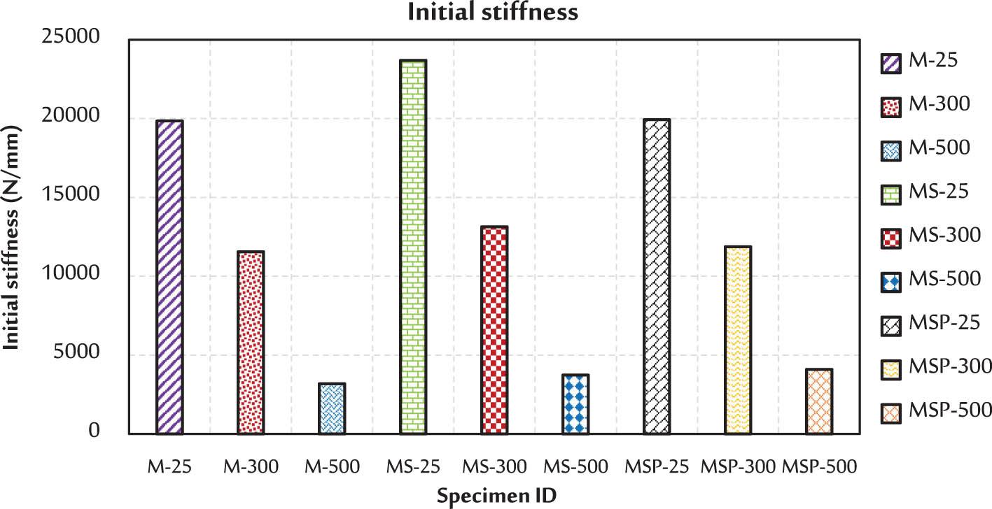 The stiffness of the reinforced concrete components significantly influences the load distribution in reinforced concrete constructions. Therefore, the fibers employed to strengthen heated specimens must restore both their compressive strength and stiffness. Assessing the initial stiffness of GPC mixtures is essential for understanding the impact of high temperatures on the elasticity of GPC mixtures. The initial stiffness was calculated as the stress-to-strain ratio measured at 40% of the ultimate stress. The GPC specimens showed no cracks at this stress stage. Table 5 displays the initial stiffness values. The initial stiffness of the heated GPC specimens exhibited a significant reduction, as illustrated in Table 5 and Figure 10. Exposure to high temperatures (300 and 500°C) resulted in a significant decrease in initial stiffness, even in the presence of fibers. When compared to the unheated concrete cylinders, the heated GPC cylinders showed a reduction in initial stiffness of up to 45.2 and 84.2% at 300 and 500°C, respectively. The heated specimens M-300 and M-500 showed a reduction in initial stiffness of 41.8 and 83.9%, respectively, when compared to the unheated specimen M-25. Additionally, a similar trend was observed when SF and hybrid fibers were used. The reduction ratios for MS-300, MSP-300, MS-500, and MSP-500 specimens were 44.5, 45.2, 84.2, and 79.4%, respectively, in comparison to the unheated specimen of each mixture. The heated specimens with fibers exhibited an enhancement of initial stiffness relative to the heated specimens without fibers. The initial stiffness for MS-300, MSP-300, MS-500, and MSP-500 specimens showed increases of 12.0, 2.7, 14.7, and 22.2%, respectively, in comparison to the heated specimen without fibers (i.e., M-300 and M-500). The reduction in the initial stiffness can be due to the development of microcracks caused by elevated temperatures and consequently evaporated water, leading to pore structure creation in the heated specimens. Consequently, when specimens undergo axial compression, heated specimens are anticipated to demonstrate a greater extent of lateral expansion than their unheated specimen counterparts [48].