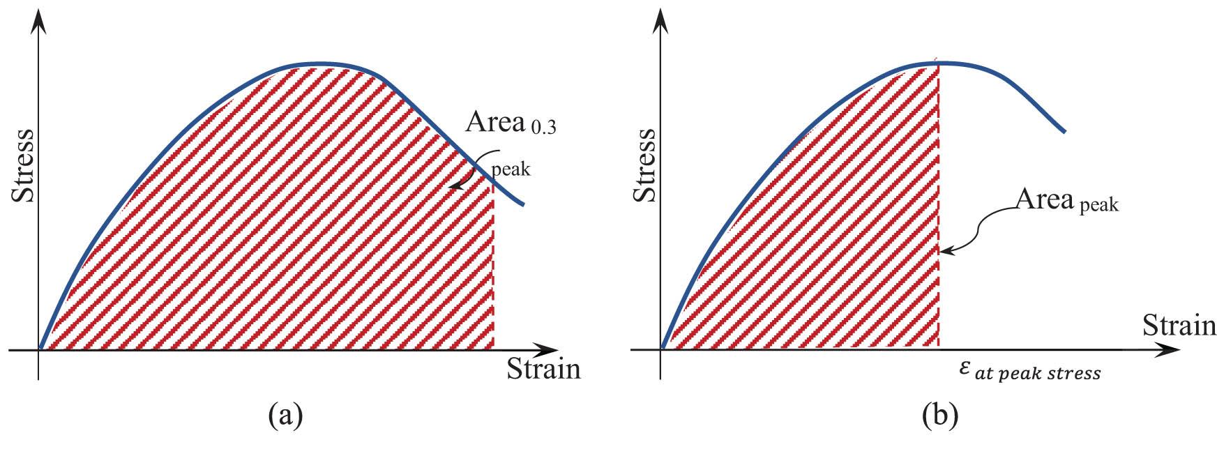 Initial stiffness of all specimens: (a) the area under the curve until 0.3 peak stress (in the decreased portion) and (b) the area under the curve until peak stress.